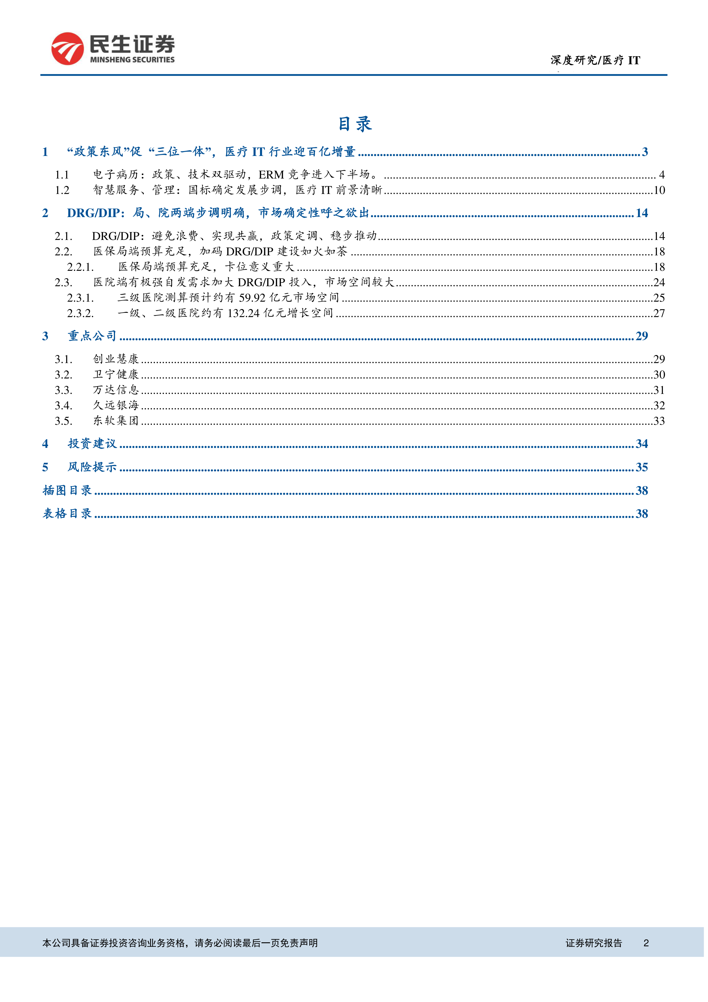本节对创业慧康、卫宁健康、万达信息、久远银海和东软集团等医疗IT龙头企业进行了简要分析,并给出了投资建议。