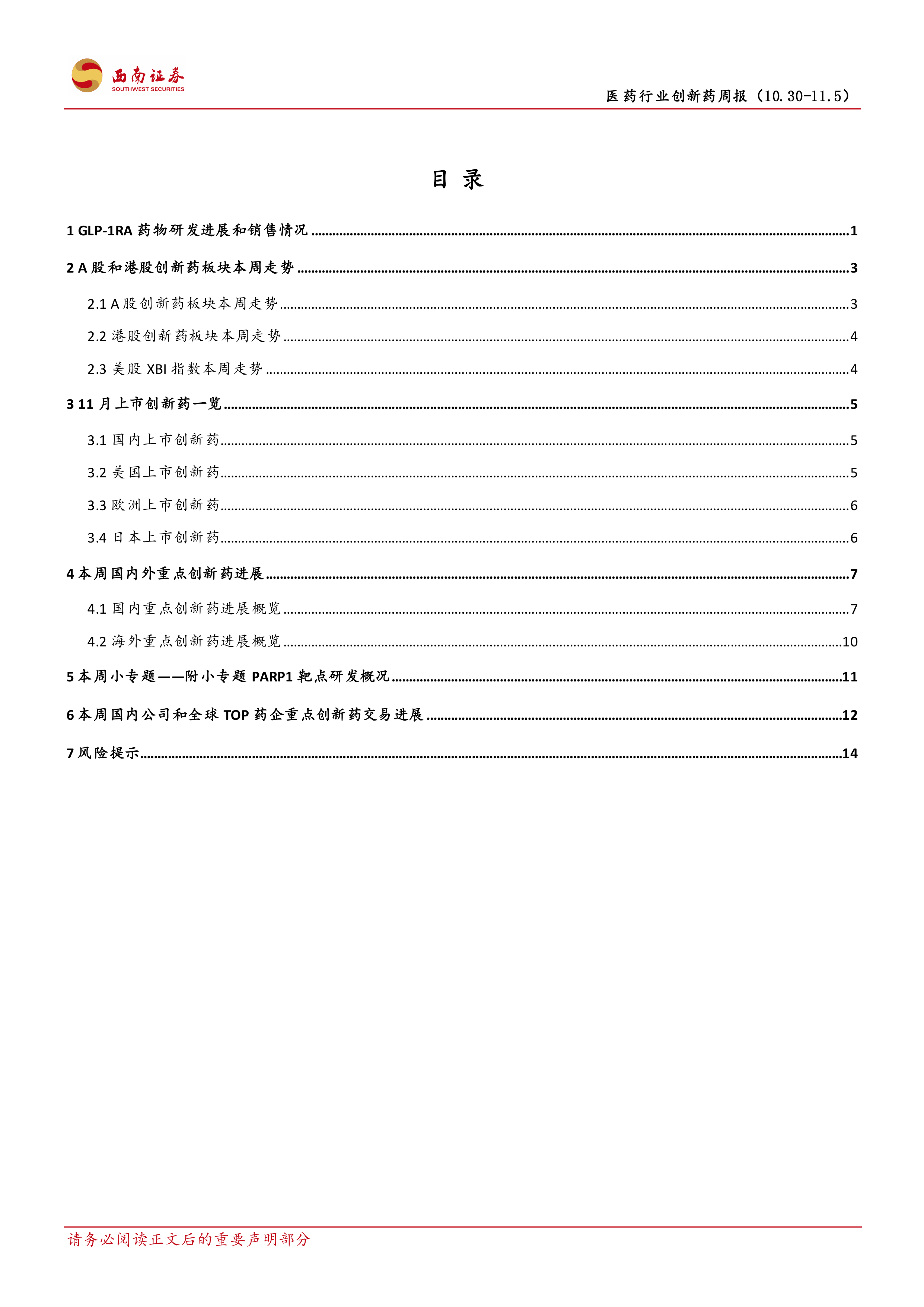 本报告的核心观点是:2023年11月第一周,A股和港股创新药板块以及美股XBI指数均表现强劲,跑赢各自市场主要指数。国内外创新药研发进展迅速,多款新药获批上市或进入临床试验阶段,同时,本周也发生多起重要的创新药交易。 报告重点关注了PARP1靶点研发进展,并对GLP-1RA药物的研发和销售情况进行了分析。