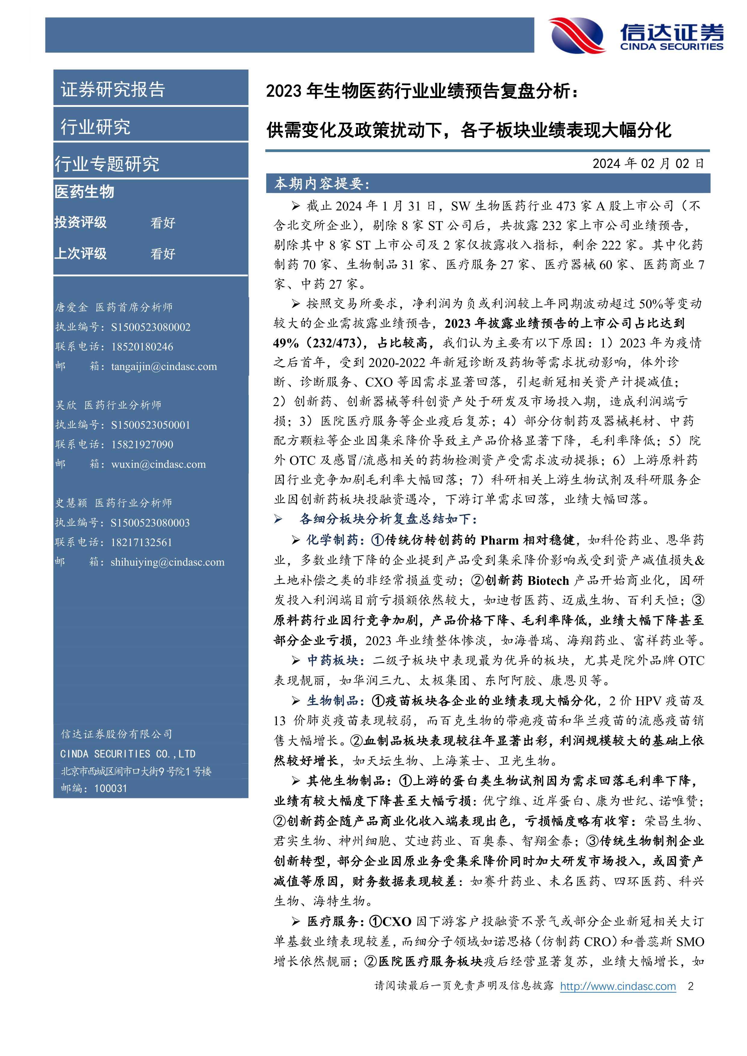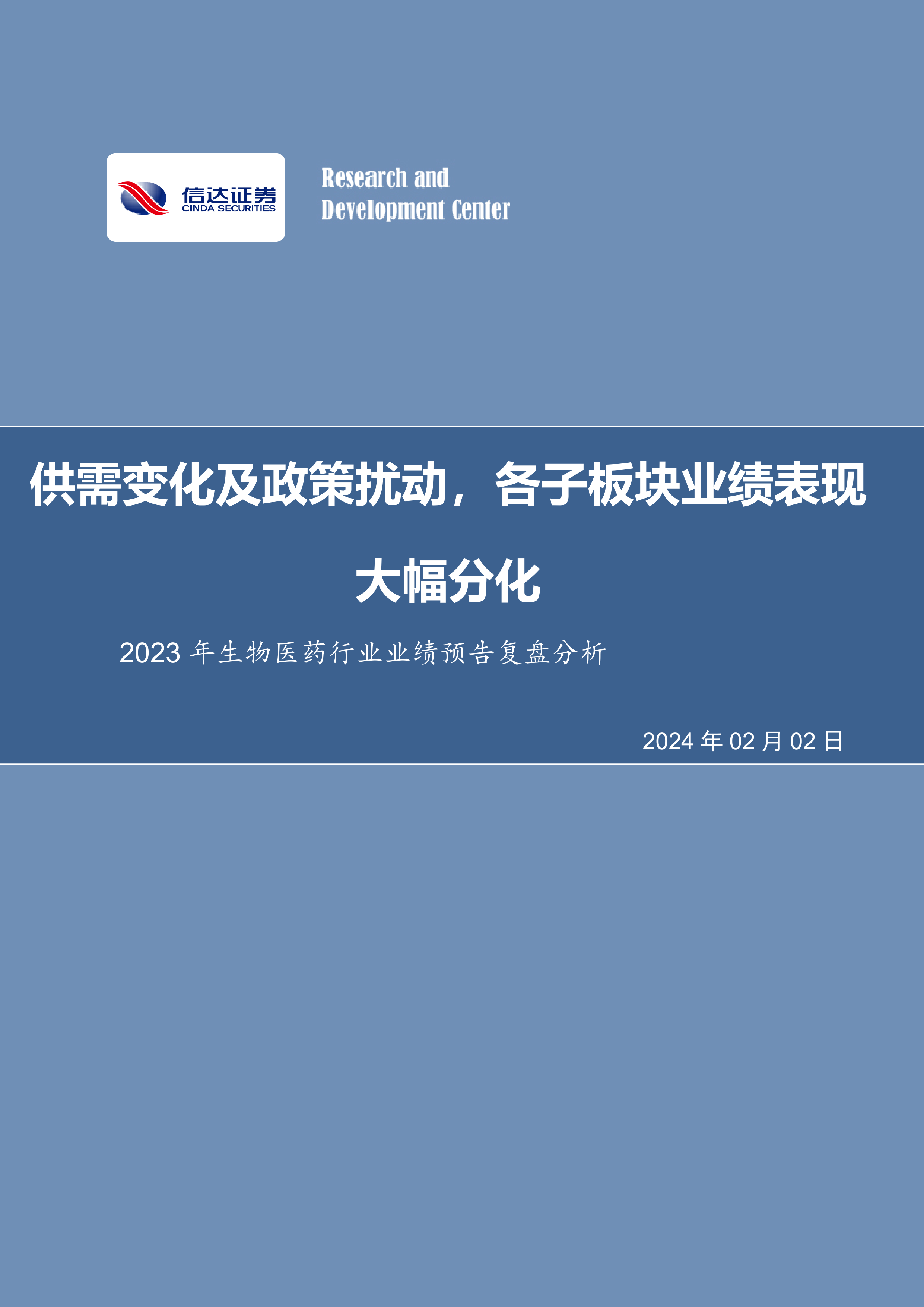 2023年生物医药行业业绩预告复盘分析:供需变化及政策扰动,各子板块业绩表现大幅分化