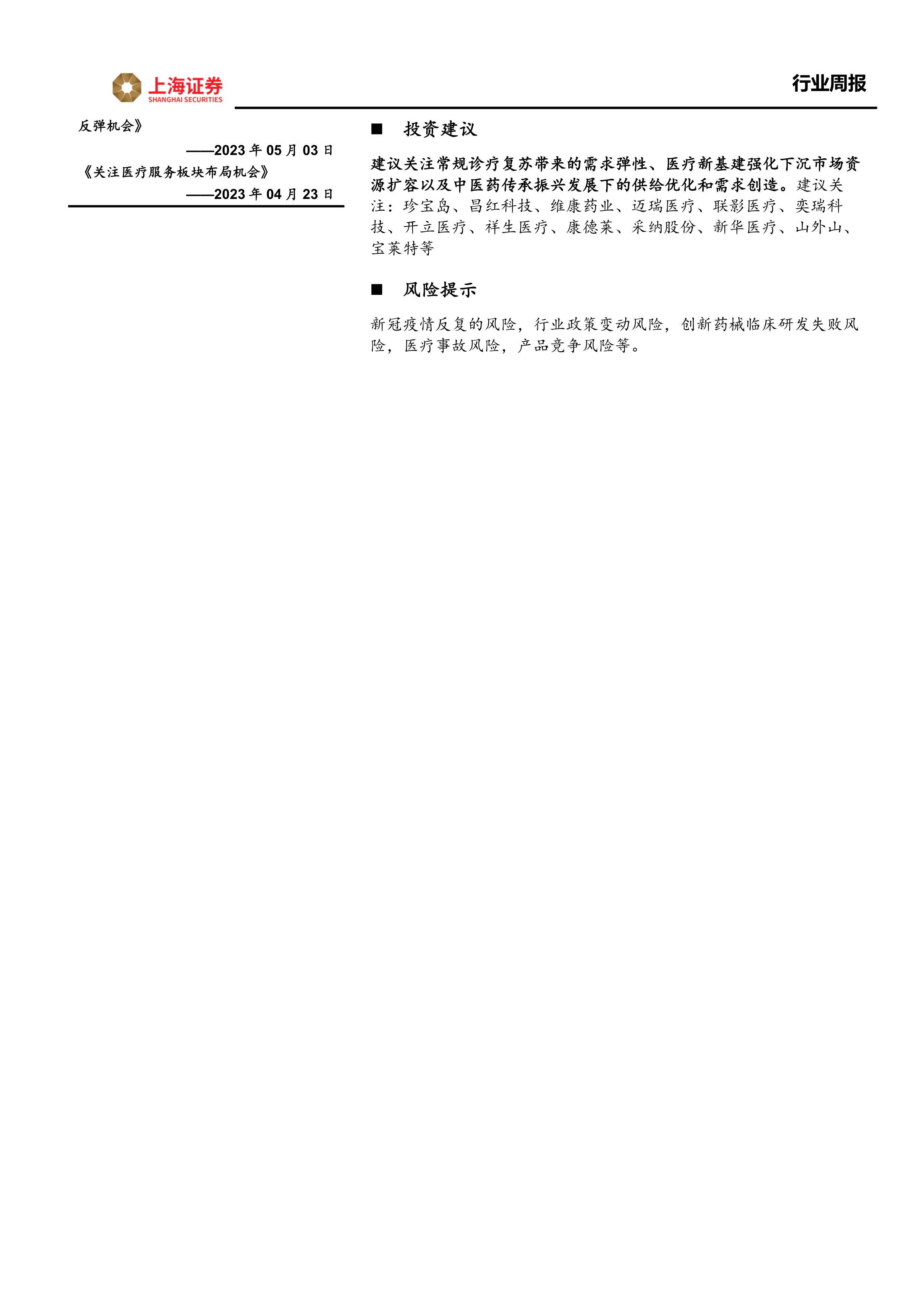 建议关注常规诊疗复苏带来的需求弹性、医疗新基建强化下沉市场资源扩容以及中医药传承振兴发展下的供给优化和需求创造。建议关注:珍宝岛、昌红科技、维康药业、迈瑞医疗、联影医疗、奕瑞科技、开立医疗、祥生医疗、康德莱、采纳股份、新华医疗、山外山、宝莱特等