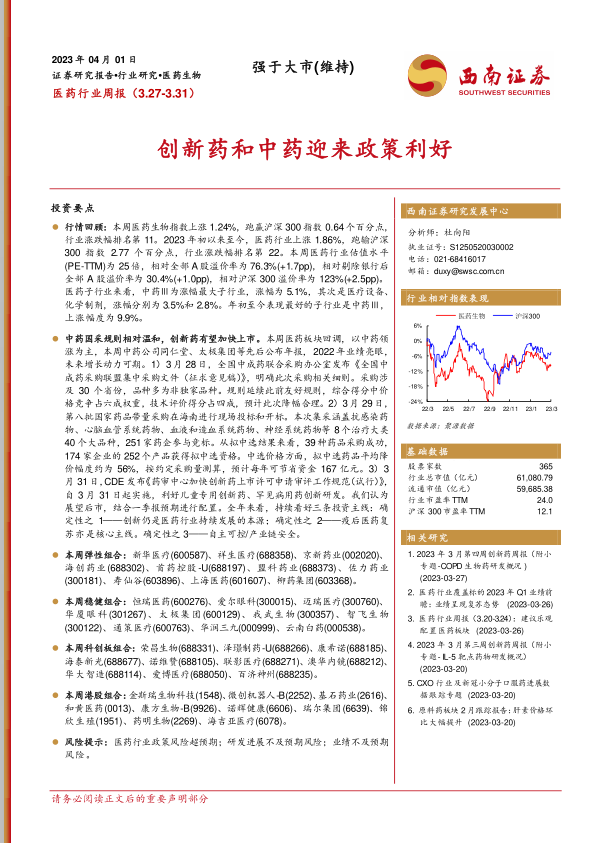 本报告对2023年3月27日至3月31日期间的医药行业进行了全面分析,数据显示医药行业本周表现强于大市,中药板块领涨,创新药政策利好不断。 报告详细分析了行业二级市场表现、估值水平、资金流向,并解读了最新的政策和行业新闻。 报告最后提出了未来医药行业投资的三条主线:创新药研发、疫后医药复苏和自主可控/产业链安全,并提供了相应的投资组合建议,为投资者提供了专业的投资参考。 然而,报告也提示了医药行业政策风险超预期、研发进展不及预期以及业绩不及预期等风险因素,投资者需谨慎决策。