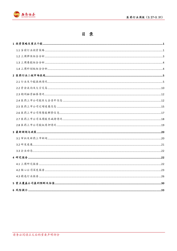 风险提示:医药行业政策风险超预期;研发进展不及预期风险;业绩不及预期风险。