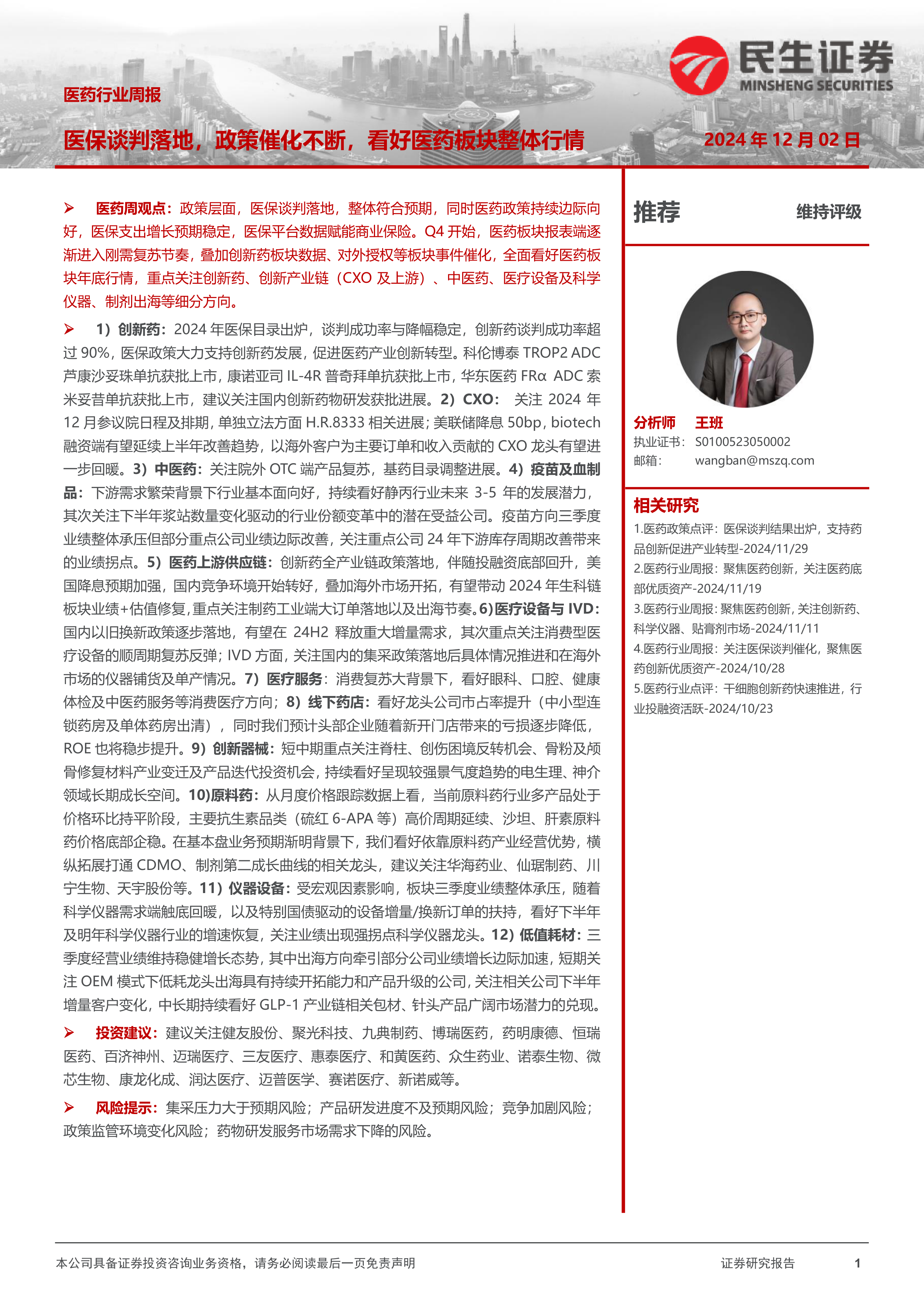 1)创新药:2024年医保目录出炉,谈判成功率与降幅稳定,创新药谈判成功率超过90%,医保政策大力支持创新药发展,促进医药产业创新转型。科伦博泰TROP2ADC芦康沙妥珠单抗获批上市,康诺亚司IL-4R普奇拜单抗获批上市,华东医药FRα ADC索米妥昔单抗获批上市,建议关注国内创新药物研发获批进展。2)CXO:关注2024年12月参议院日程及排期,单独立法方面H.R.8333相关进展;美联储降息50bp,biotech融资端有望延续上半年改善趋势,以海外客户为主要订单和收入贡献的CXO龙头有望进一步回暖。3)中医药:关注院外OTC端产品复苏,基药目录调整进展。4)疫苗及血制品:下游需求繁荣背景下行业基本面向好,持续看好静丙行业未来3-5年的发展潜力,其次关注下半年浆站数量变化驱动的行业份额变革中的潜在受益公司。疫苗方向三季度业绩整体承压但部分重点公司业绩边际改善,关注重点公司24年下游库存周期改善带来的业绩拐点。5)医药上游供应链:创新药全产业链政策落地,伴随投融资底部回升,美国降息预期加强,国内竞争环境开始转好,叠加海外市场开拓,有望带动2024年生科链板块业绩+估值修复,重点关注制药工业端大订单落地以及出海节奏。6)医疗设备与IVD:国内以旧换新政策逐步落地,有望在24H2释放重大增量需求,其次重点关注消费型医疗设备的顺周期复苏反弹;IVD方面,关注国内的集采政策落地后具体情况推进和在海外市场的仪器铺货及单产情况。7)医疗服务:消费复苏大背景下,看好眼科、口腔、健康体检及中医药服务等消费医疗方向;8)线下药店:看好龙头公司市占率提升(中小型连锁药房及单体药房出清),同时我们预计头部企业随着新开门店带来的亏损逐步降低,ROE也将稳步提升。9)创新器械:短中期重点关注脊柱、创伤困境反转机会、骨粉及颅骨修复材料产业变迁及产品迭代投资机会,持续看好呈现较强景气度趋势的电生理、神介领域长期成长空间。10)原料药:从月度价格跟踪数据上看,当前原料药行业多产品处于价格环比持平阶段,主要抗生素品类(硫红6-APA等)高价周期延续、沙坦、肝素原料药价格底部企稳。在基本盘业务预期渐明背景下,我们看好依靠原料药产业经营优势,横纵拓展打通CDMO、制剂第二成长曲线的相关龙头,建议关注华海药业、仙琚制药、川宁生物、天宇股份等。11)仪器设备:受宏观因素影响,板块三季度业绩整体承压,随着科学仪器需求端触底回暖,以及特别国债驱动的设备增量/换新订单的扶持,看好下半年及明年科学仪器行业的增速恢复,关注业绩出现强拐点科学仪器龙头。12)低值耗材:三季度经营业绩维持稳健增长态势,其中出海方向牵引部分公司业绩增长边际加速,短期关注OEM模式下低耗龙头出海具有持续开拓能力和产品升级的公司,关注相关公司下半年增量客户变化,中长期持续看好GLP-1产业链相关包材、针头产品广阔市场潜力的兑现。