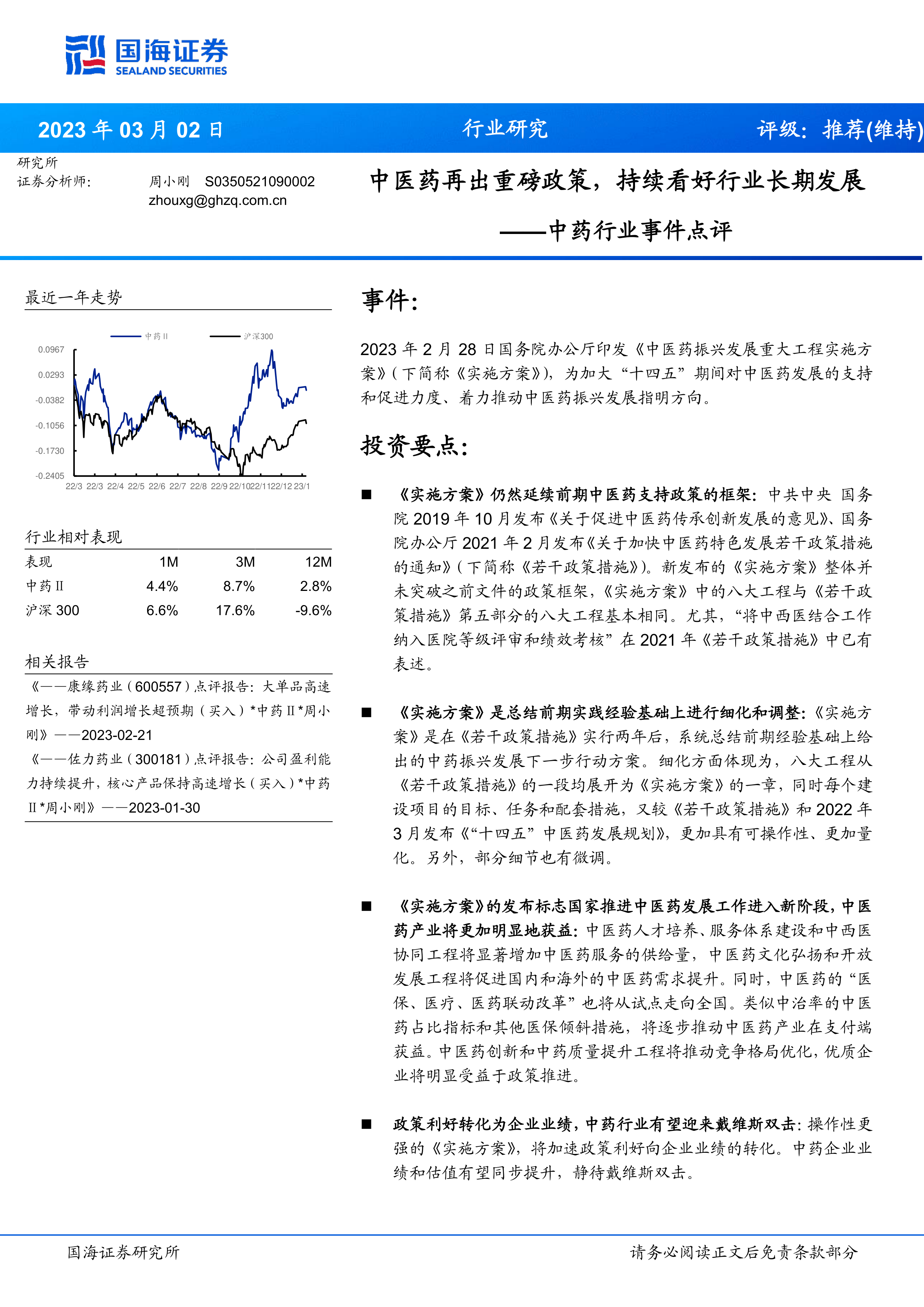 这份国海证券研究所发布的行业研究报告,核心观点是:2023年2月28日国务院办公厅印发的《中医药振兴发展重大工程实施方案》(简称《实施方案》)标志着国家对中医药发展支持进入新阶段,将加速政策利好向企业业绩转化,利好中药行业长期发展,预计将带来“戴维斯双击”效应(业绩和估值同步提升)。 报告维持对中药行业的“推荐”评级,并推荐了多个重点关注个股。