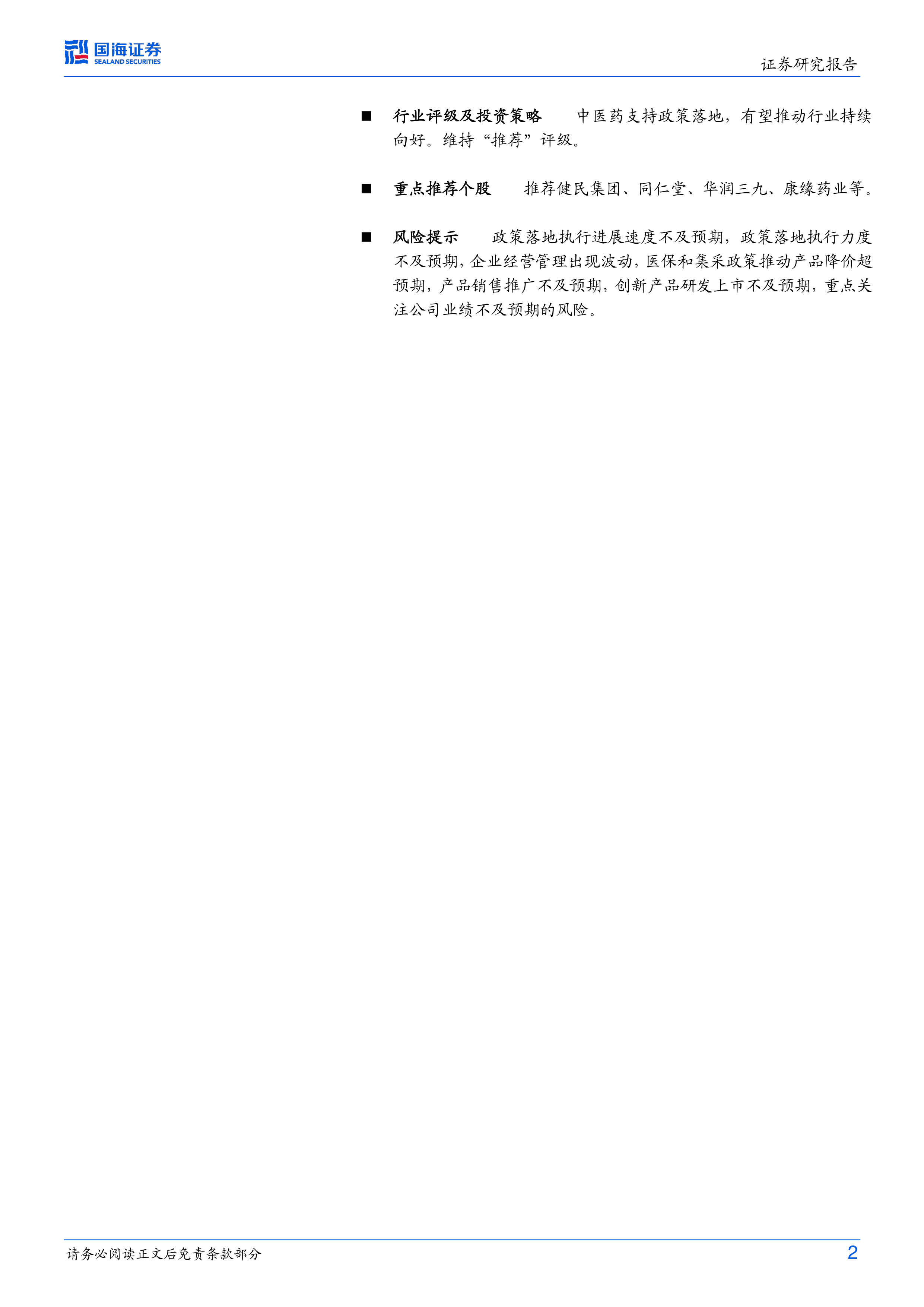 行业评级及投资策略中医药支持政策落地,有望推动行业持续向好。维持“推荐”评级。