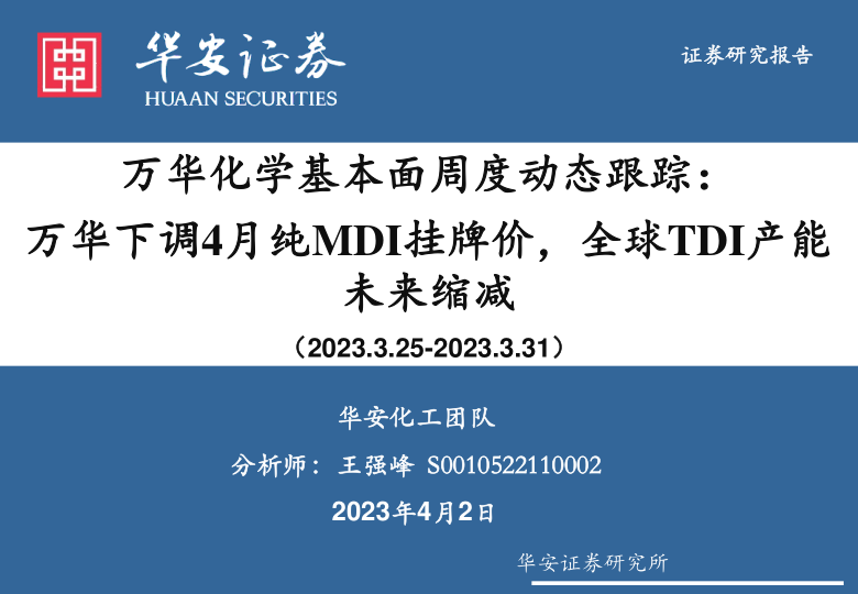 万华化学基本面周度动态跟踪:万华下调4月纯MDI挂牌价,全球TDI产能未来缩减