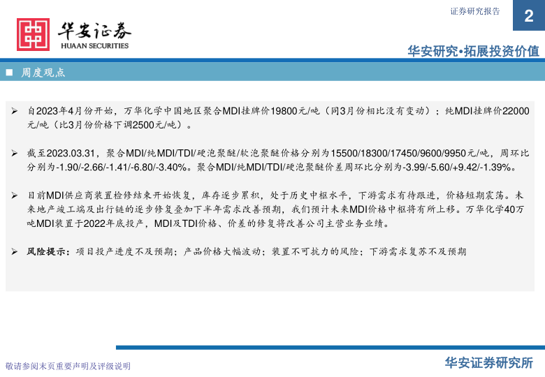 本报告按照以下目录结构展开,对万华化学的基本面进行了周度动态跟踪: