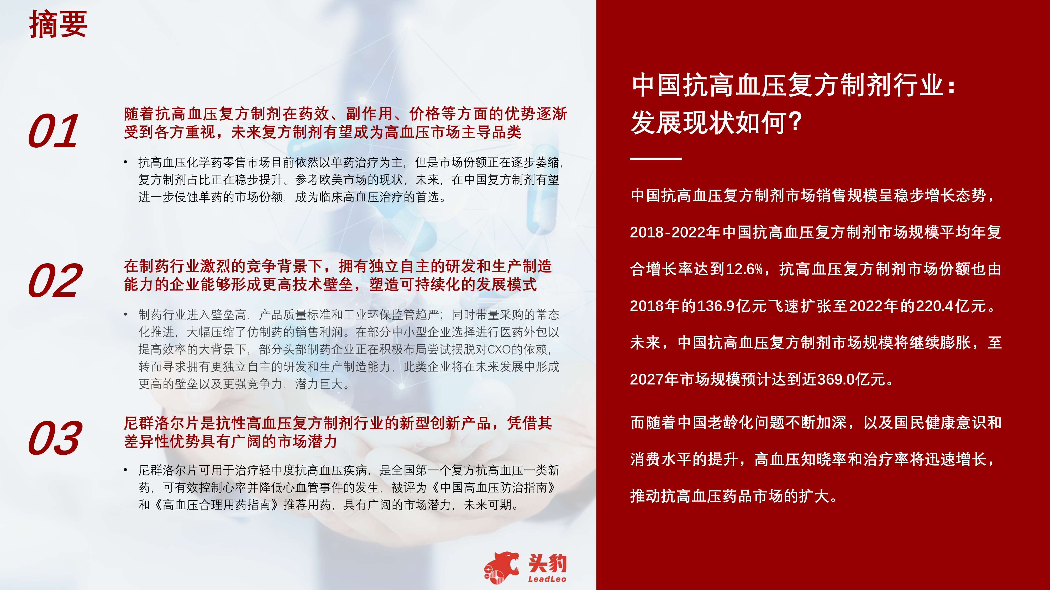报告首先概述了高血压的定义、发病机制和中国高血压疾病现状,指出高血压患病率持续增长,治疗市场潜力巨大。接着,报告回顾了抗高血压药物的发展历程,分析了抗高血压单药的作用机制和优劣势,并详细阐述了抗高血压复方制剂的定义、分类、优势以及与单药治疗的比较。数据显示,复方制剂市场份额稳步提升,未来有望成为高血压治疗的首选。