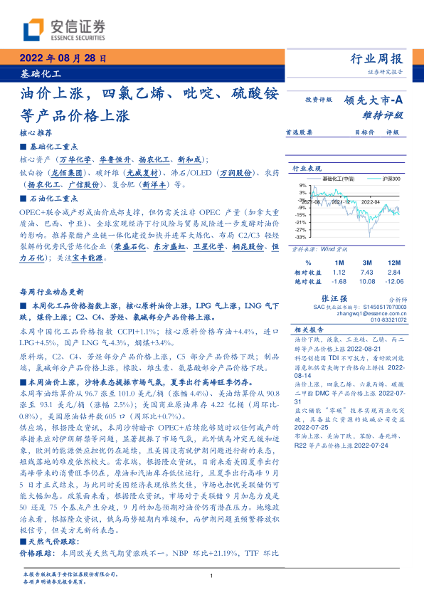 基础化工行业周报:油价上涨,四氯乙烯、吡啶、硫酸铵等产品价格上涨