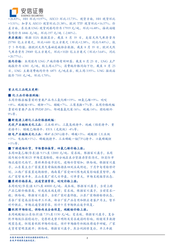 本报告的核心观点是:受国际油价上涨及国内市场供需变化的影响,部分基础化工产品价格出现上涨,其中四氯乙烯、吡啶、硫酸铵等产品涨幅显著。同时,天然气价格波动剧烈,欧美市场涨跌互现,国内价格有所回落。新能源上游化工品价格涨跌分化,光伏产业链部分产品价格下跌,锂电产业链部分产品价格上涨。总体而言,基础化工行业面临着原料价格波动、下游需求变化等多重挑战。