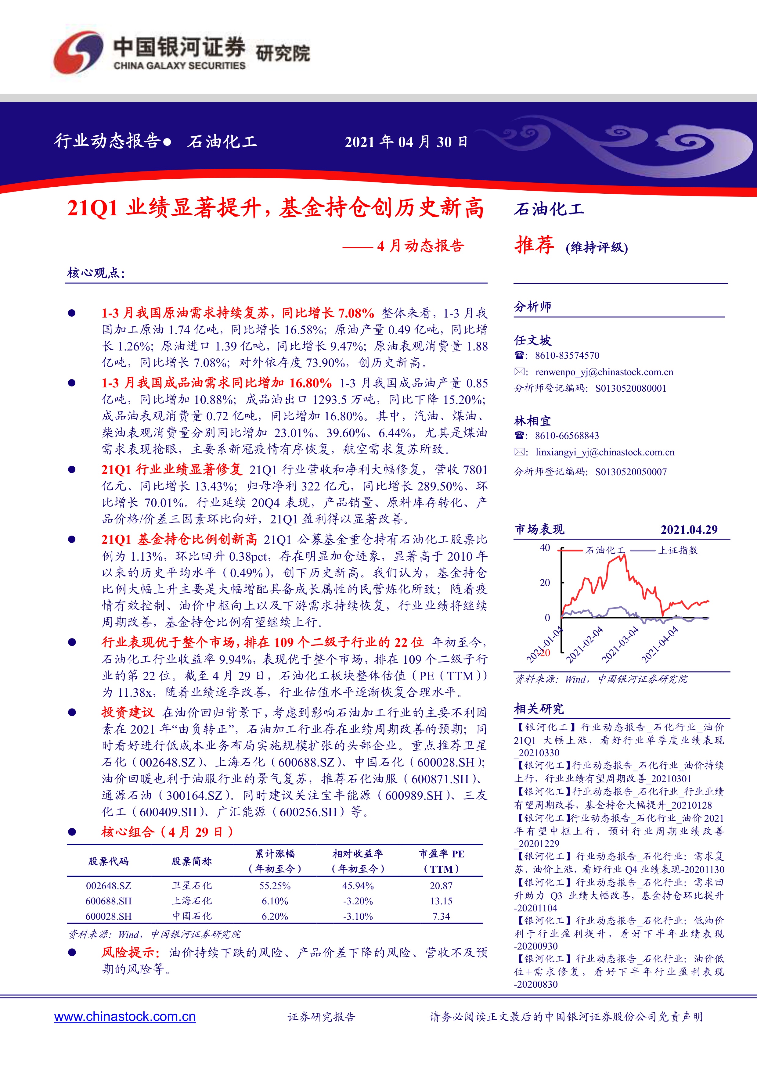 石油化工4月动态报告:21Q1业绩显著提升,基金持仓创历史新高