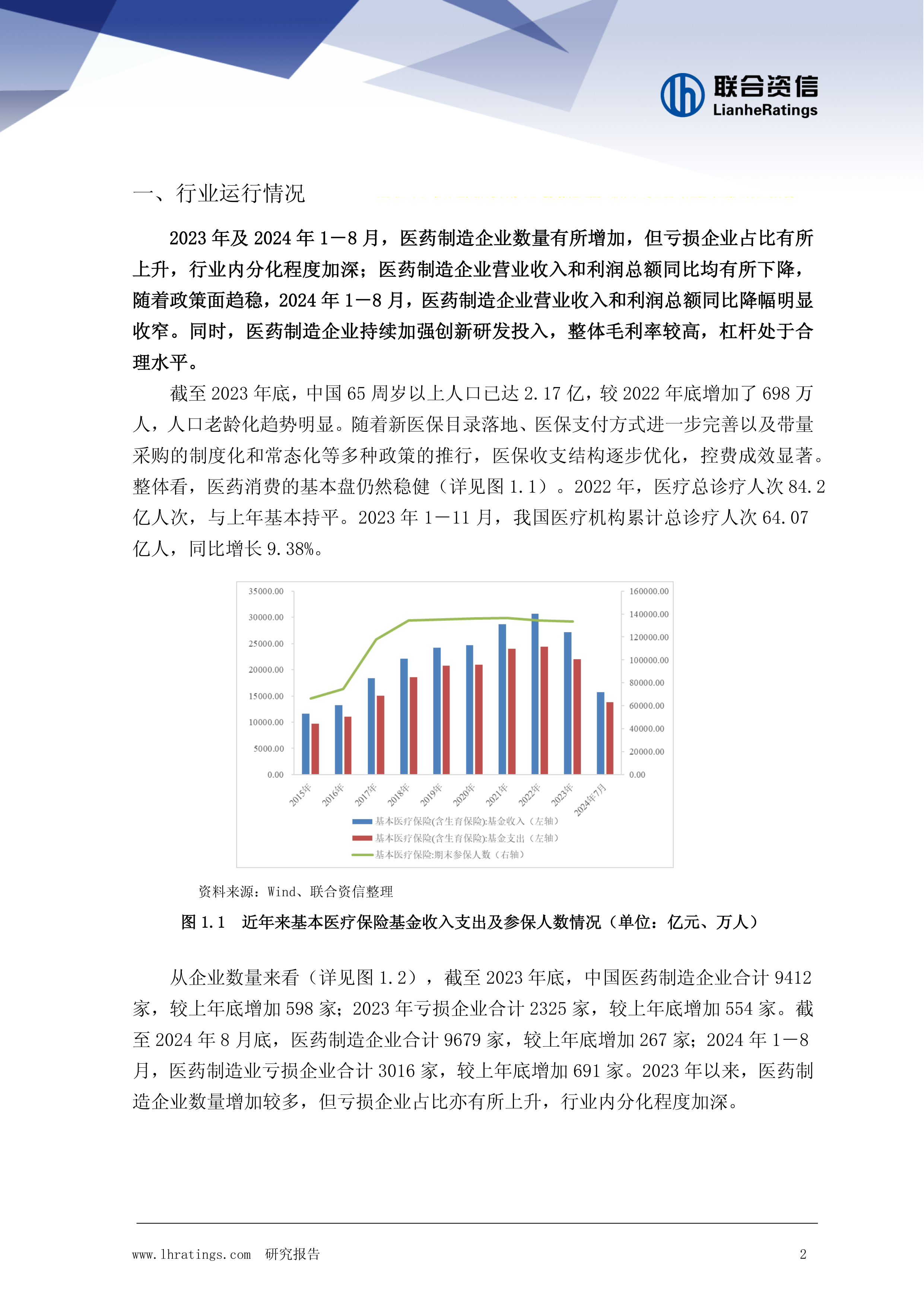 本节分析了中国人口老龄化趋势以及新医保目录落地、医保支付方式改革、带量采购常态化等政策对医药消费的影响。数据显示,65岁以上人口持续增长,人口老龄化趋势明显。同时,医保政策的实施优化了医保收支结构,控费成效显著,但医药制造企业营业收入和利润总额仍出现波动,2023年同比下降,2024年前八个月降幅有所收窄。
