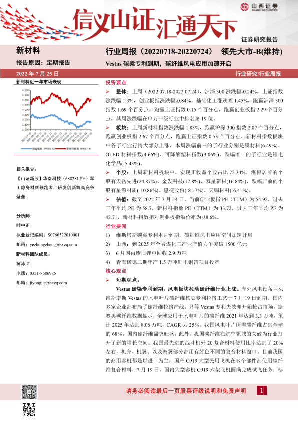 报告总结了本周新材料行业的几条重要新闻:Vestas碳梁专利到期,将加速碳纤维在风电领域的应用;山西省力争到2025年煤化工产业产值突破1500亿元,推动煤化工产业绿色低碳发展;6月份国内废旧锂电池回收量达2.9万吨;青海诺德二期年产1.5万吨锂电铜箔项目投产。这些新闻反映了新材料行业在政策支持、技术进步和市场需求等方面的积极发展态势。