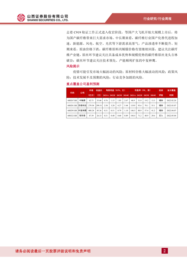 Vestas碳梁专利到期,风电板块拉动碳纤维行业上涨。海外风电设备巨头维斯塔斯Vestas的风电叶片碳纤维核心专利拉挤工艺于7月19日到期。国内多家企业都布局了碳纤维拉挤产线,只等Vestas专利失效即开始抢占市场。据赛奥碳纤维数据显示,全球应用于风电叶片的碳纤维2021年达到3.3万吨,预计2025年达到8.06万吨,CAGR为25%。我国风电叶片所需碳纤维占到全球的68%,国内碳纤维需求旺盛。此外,我国碳纤维在航空领域的突破为行业打开了新的增长空间。我国最先进的战斗机歼20复合材料使用比率达到了20%左右,机身、机翼、以及鸭翼部分都用有颜色不同的复合材料窗口。目前我国的商用客机都是以进口为主,国产C919大型民用飞机在多个部件都使用碳纤维复合材料,7月19日,国内大型客机C919六架飞机圆满完成试飞任务,标志着C919取证工作正式进入收官阶段,等国产大飞机开始大规模上市后,将为国产碳纤维带来巨大需求市场。中长期来看,碳纤维行业国产化替代进程加速,新能源、风电、航空、光伏等下游需求高景气,产品渗透率不断提升。短期来看,原油价格下跌,碳纤维原料丙烯腈价格有望继续回落,建议关注碳纤维产业链,原丝环节建议关注具备成本优势和规模优势的碳纤维原丝龙头吉林碳谷;碳丝环节建议关注技术领先、产能顺利扩张的中复神鹰。