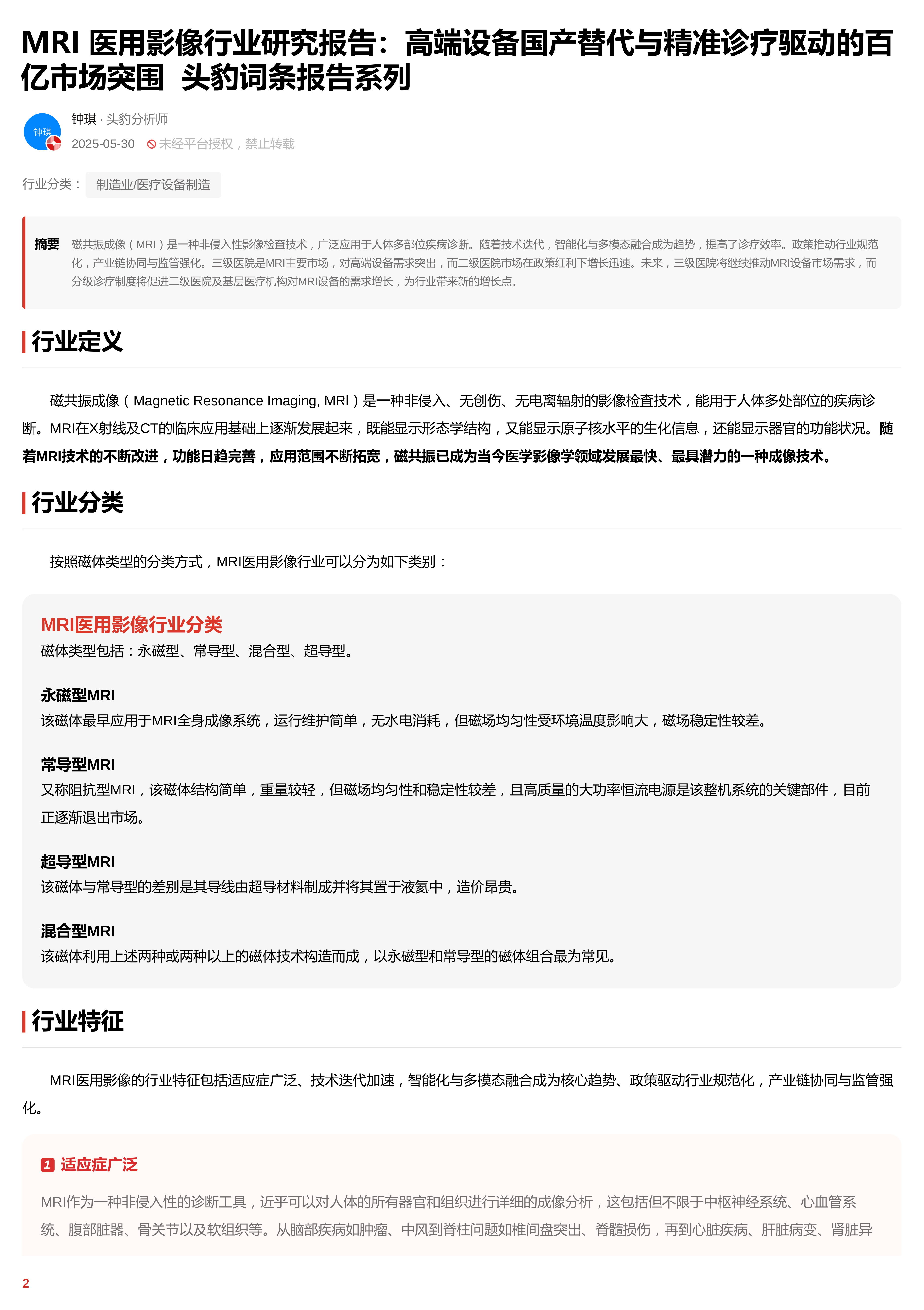 MRI医用影像行业研究报告:高端设备国产替代与精准诊疗驱动的百亿市场突围头 豹词条报告系列