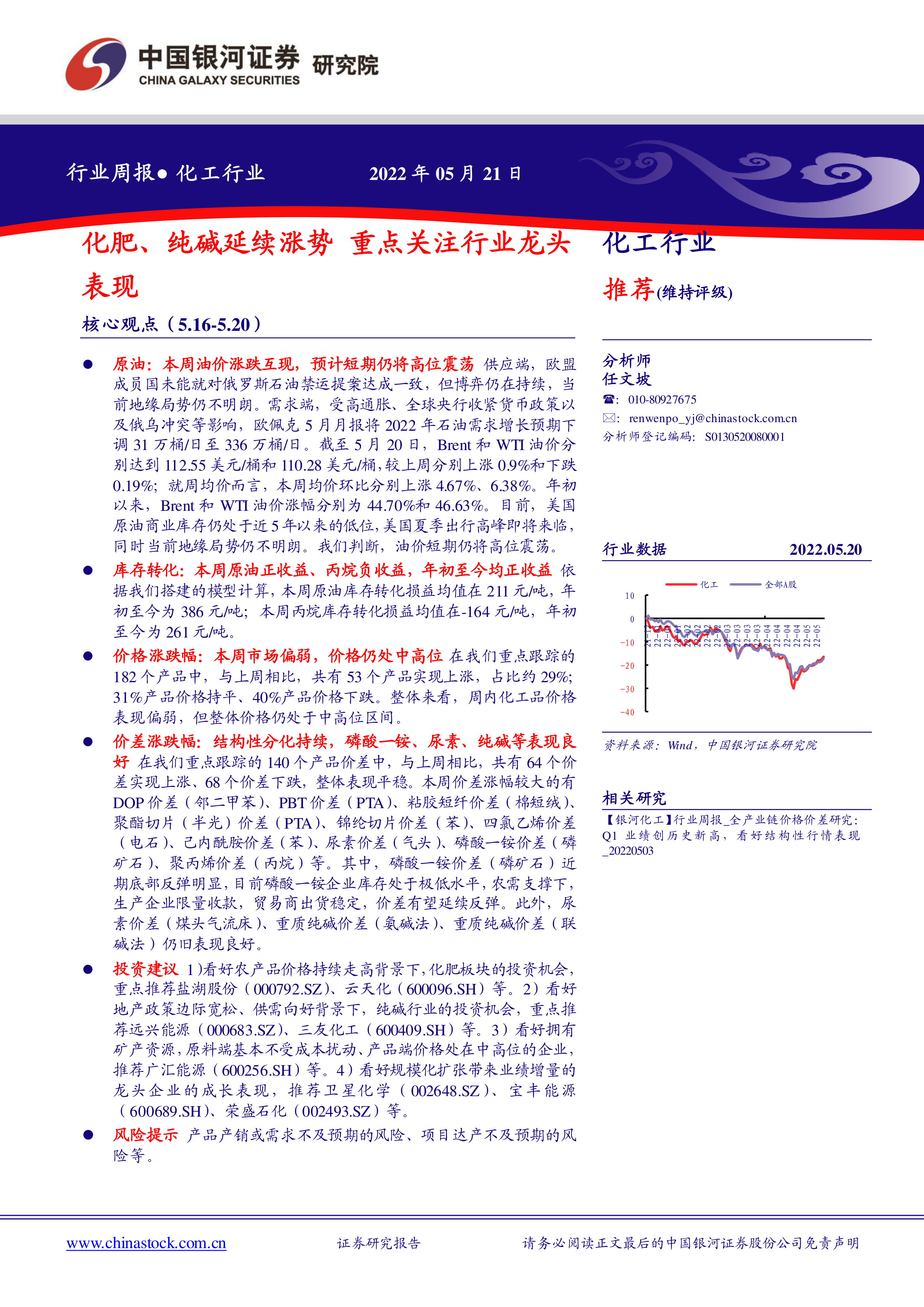 本报告的核心观点是:本周化工行业市场表现分化,结构性行情延续。原油价格短期仍将高位震荡,化肥和纯碱板块表现良好,值得关注行业龙头企业。
