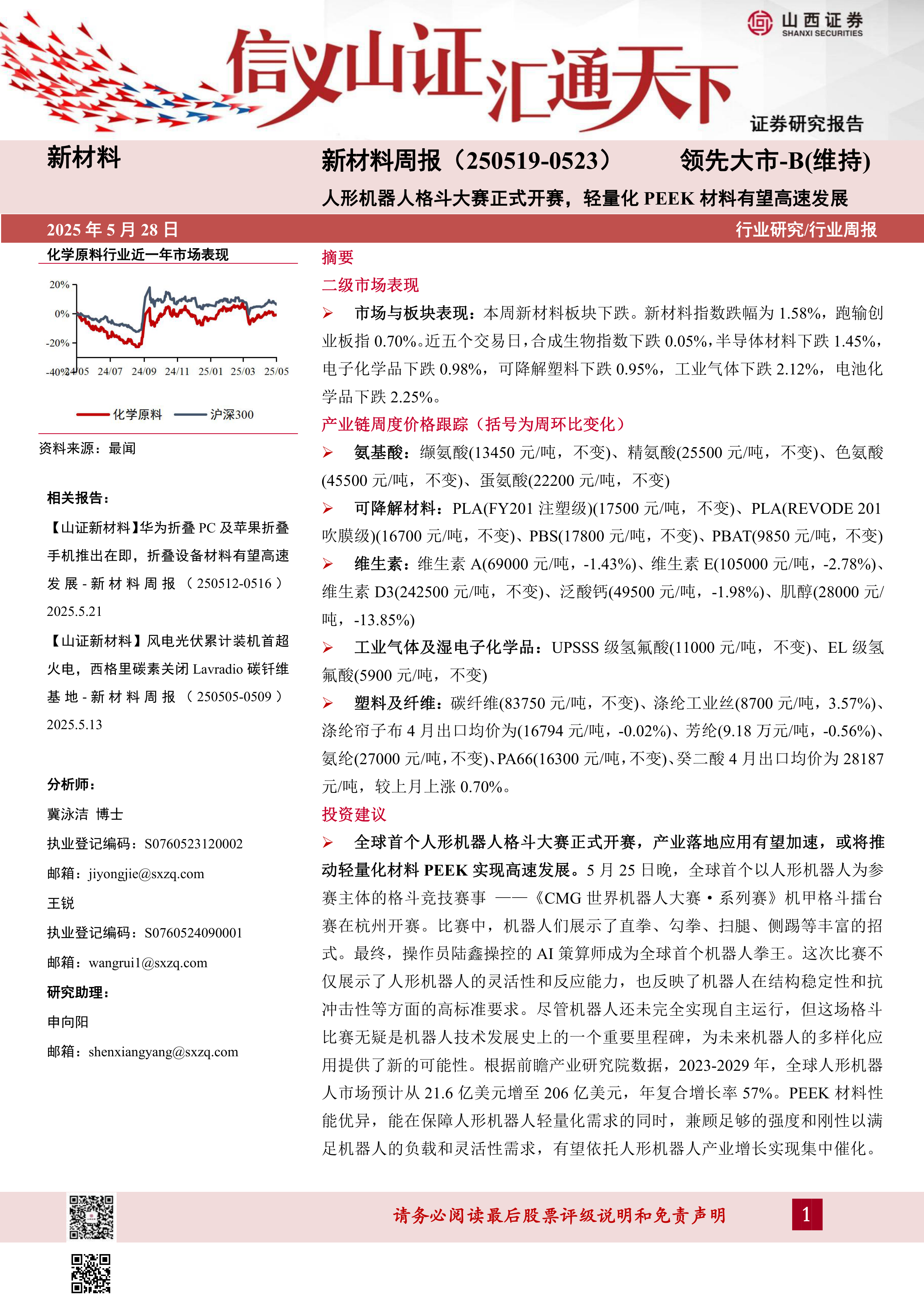 本报告的核心观点是:新材料板块本周表现弱于大盘,但人形机器人格斗大赛的举办以及折叠手机的即将推出,为轻量化PEEK材料和折叠设备材料带来了新的增长机遇。报告详细分析了新材料二级市场表现、产业链价格波动以及行业要闻,并基于市场趋势和技术发展,提出了相应的投资建议和风险提示。