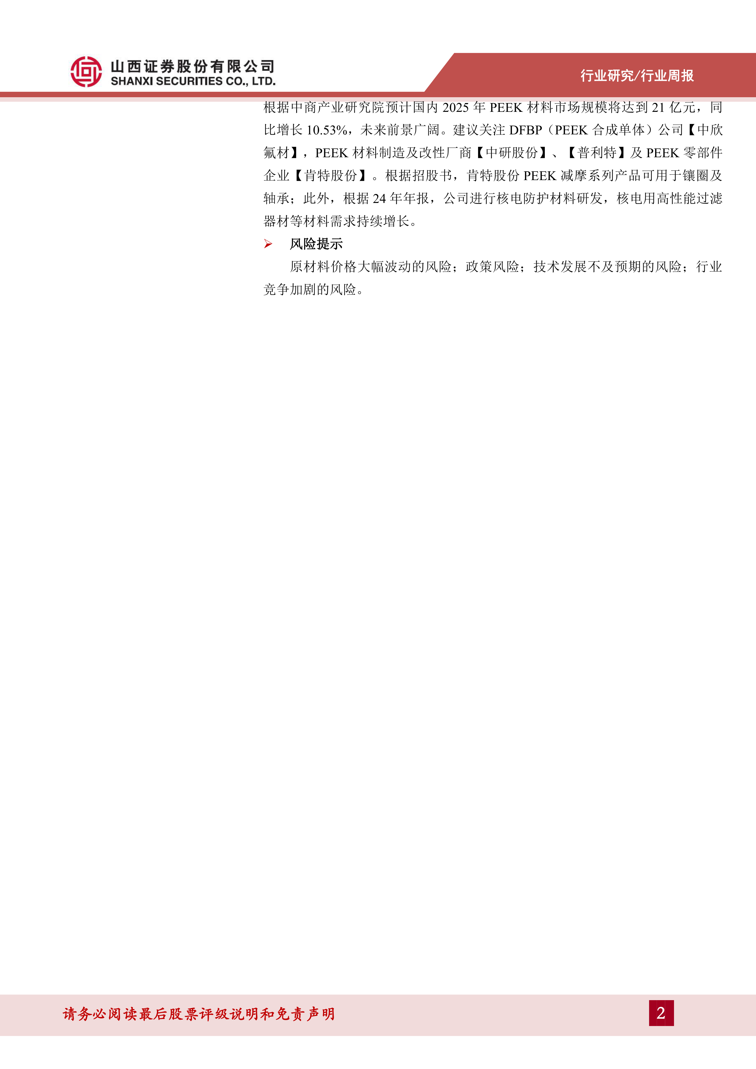 本报告对新材料行业进行了全面的分析,既展现了当前市场表现的疲软,也指出了PEEK材料和折叠设备材料等细分领域的巨大潜力。人形机器人格斗大赛的成功举办以及折叠手机市场的兴起,为新材料行业带来了新的增长机遇。投资者应密切关注市场动态,谨慎决策,并充分考虑报告中提到的风险因素。 报告中提供的价格数据和市场分析,为投资者提供了重要的参考信息,但不能作为投资的唯一依据。