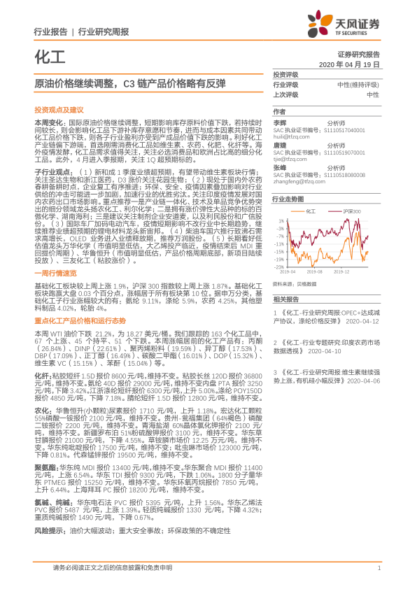 子行业观点:(1)新和成 1 季度业绩超预期,有望带动维生素板块行情;关注圣达生物和浙江医药,D3 涨价关注花园生物;(2)现处于国内外农药春耕备耕时点,企业复工有序推进;环保、安全、疫情因素叠加影响对行业供给的冲击可能进一步加剧,加速行业的优胜劣汰。关注印度疫情发展对国内农药出口市场影响。重点推荐一是产业链一体化、技术及单品竞争优势突出的细分领域龙头扬农化工、利尔化学;二是拥有涨价弹性大品种的标的百傲化学、湖南海利;三是建议关注制剂企业安道麦,以及利民股份和广信股份。(3)国际车厂加码电动汽车,疫情短期影响不改行业中长期趋势,继续推荐业绩超预期的锂电材料龙头新宙邦。(4)柴油车国六推行致沸石需求高增长,OLED 业务进入业绩释放期,推荐万润股份。(5)长期看好低估值龙头万华化学(市值明显低估,大乙烯投产临近,疫情结束后 MDI 重回提价周期)、华鲁恒升(市值明显低估,产品价格周期底部,新项目陆续投放)、三友化工(粘胶涨价)。
