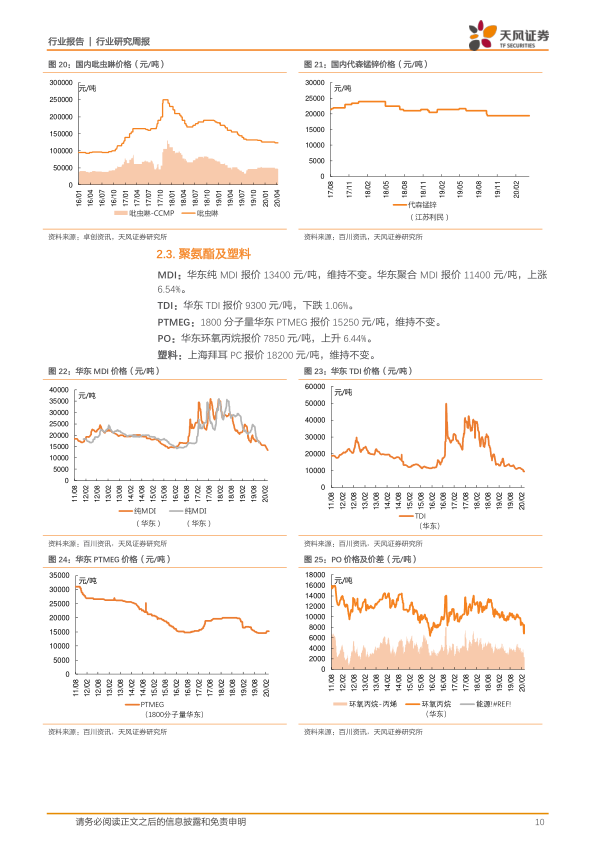 聚氨酯: 华东纯 MDI 报价 13400 元/吨,维持不变。华东聚合 MDI 报价 11400元/吨,上涨 6.54%。华东 TDI 报价 9300 元/吨,下跌 1.06%。1800 分子量华东 PTMEG 报价 15250 元/吨,维持不变。华东环氧丙烷报价 7850 元/吨,上升 6.44%。上海拜耳 PC 报价 18200 元/吨,维持不变。氯碱、纯碱:华东电石法 PVC 报价 5395 元/吨,上升 1.56%。华东乙烯法PVC 报价 5487 元/吨,上涨 1.39%。轻质纯碱报价 1330 元/吨,下降 4.32%;重质纯碱报价 1490 元/吨,下降 0.67%。