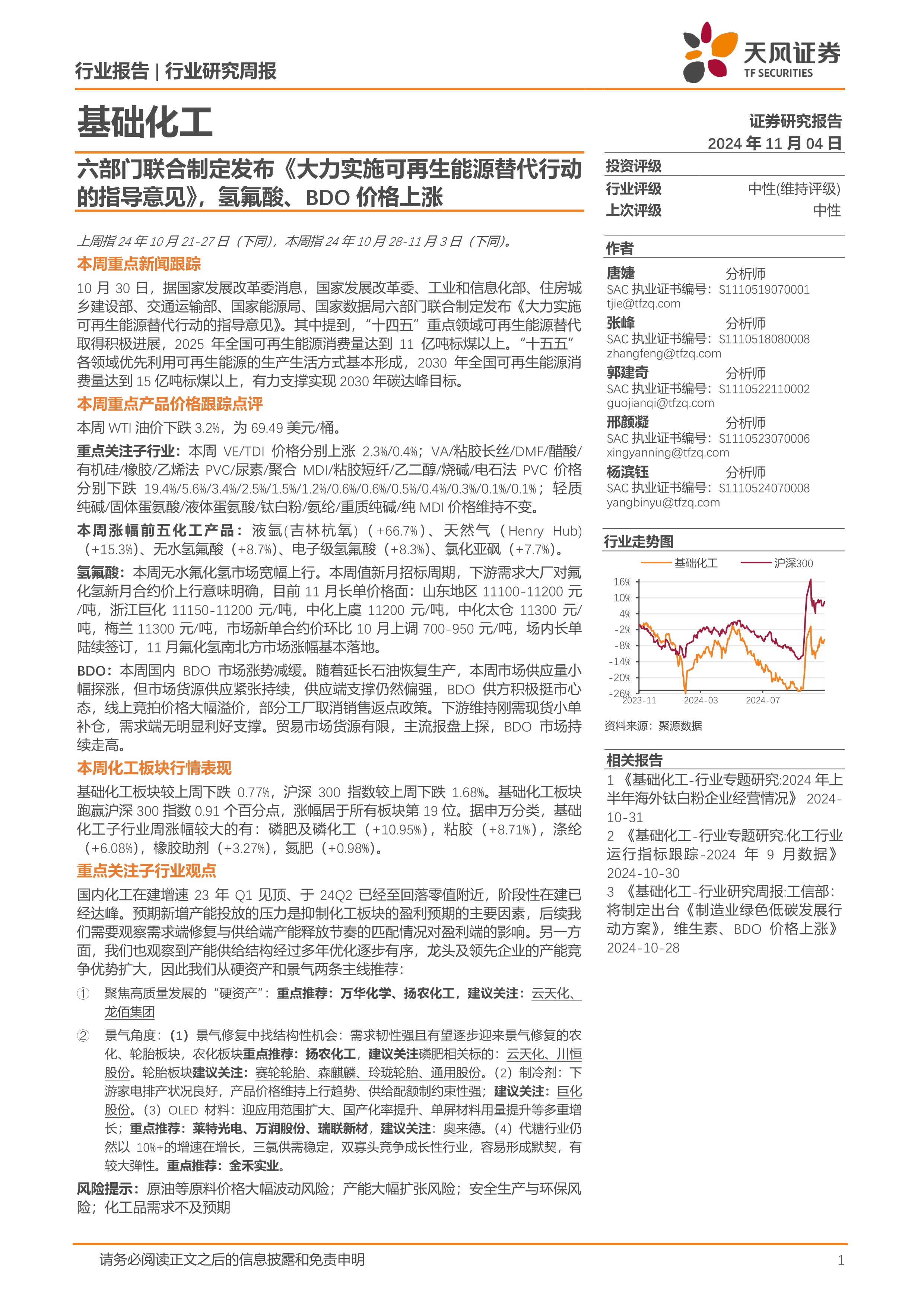 基础化工行业研究周报:六部门联合制定发布《大力实施可再生能源替代行动的指导意见》,氢氟酸、BDO价格上涨