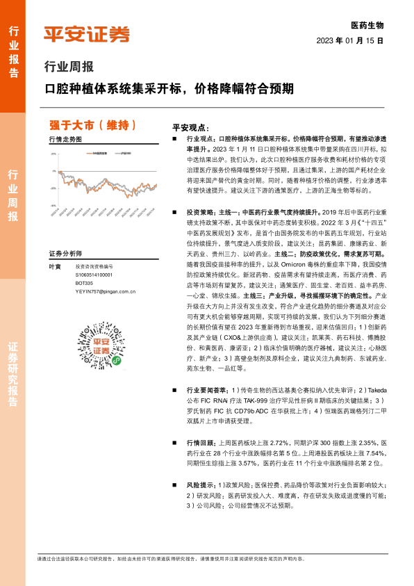 本报告对2023年1月11日口腔种植体系统集采开标结果进行了深入分析,认为价格降幅符合预期,将显著提升种植牙渗透率,并推荐了相关投资标的。此外,报告还分析了中医药行业、疫情后医疗消费复苏以及产业升级带来的投资机会,并推荐了一系列值得关注的股票,为投资者提供了全面的市场分析和投资建议。 报告数据翔实,分析专业,为投资者提供了有价值的参考信息。 但需注意报告中提到的风险提示,投资需谨慎。