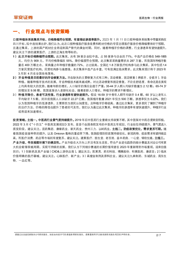 本报告的核心观点是:口腔种植体系统集采开标结果符合预期,价格大幅下降将显著提升种植牙渗透率,利好相关企业。同时,报告分析了中医药行业、疫情后医疗消费复苏以及产业升级带来的投资机会,并推荐了一系列值得关注的股票。
