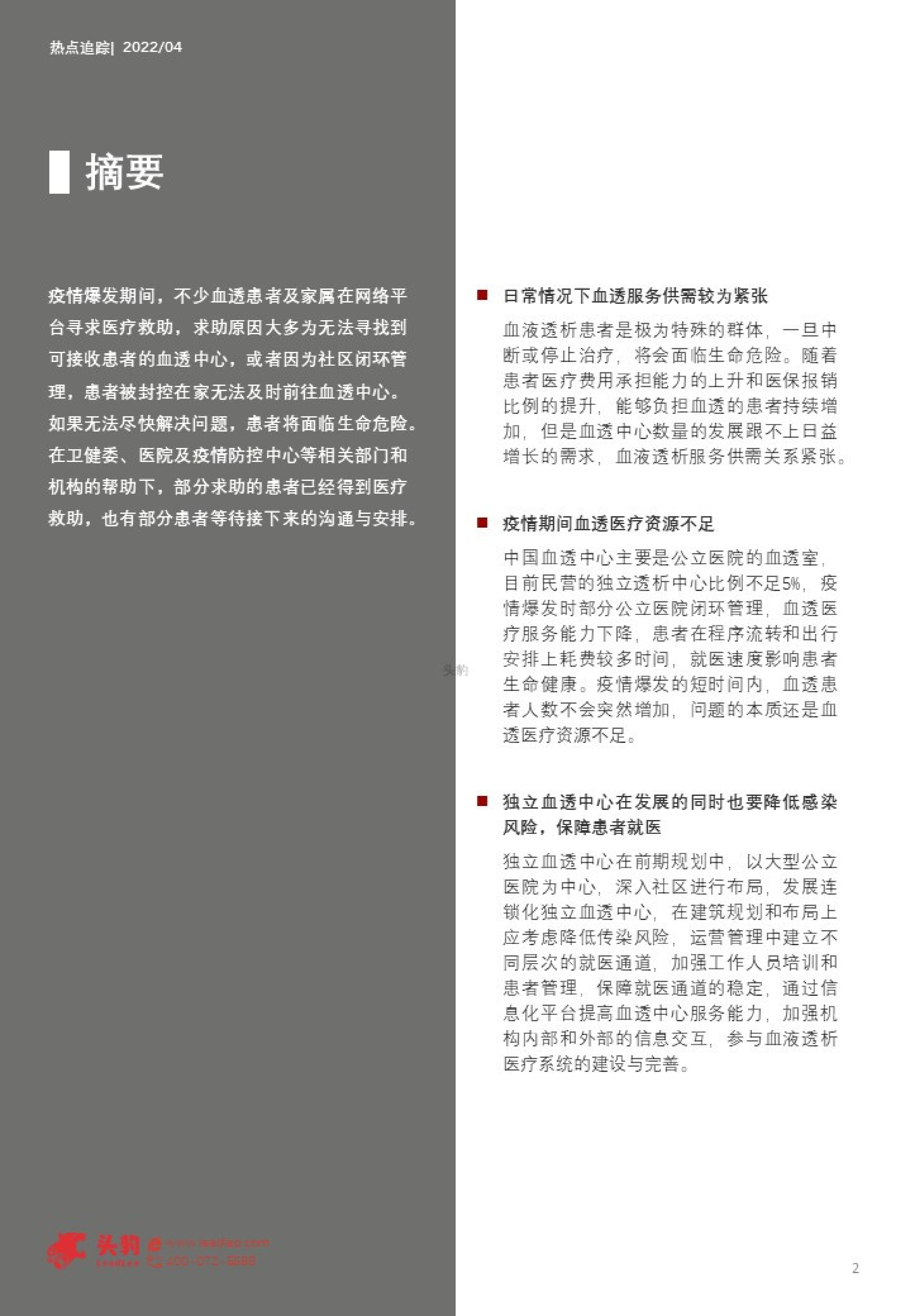 中国血透中心主要是公立医院的血透室目前民营的独立透析中心比例不足5%,渡情爆发时部分公立医院闭环管理,血透医疗服务能力下降,惠者在程序流转和出行安排上耗费较多时间,就医速度影响惠者生命健康。疫情爆发的短时间内,血透惠者人数不会突然增加,问题的本质还是血透医疗资源不足。