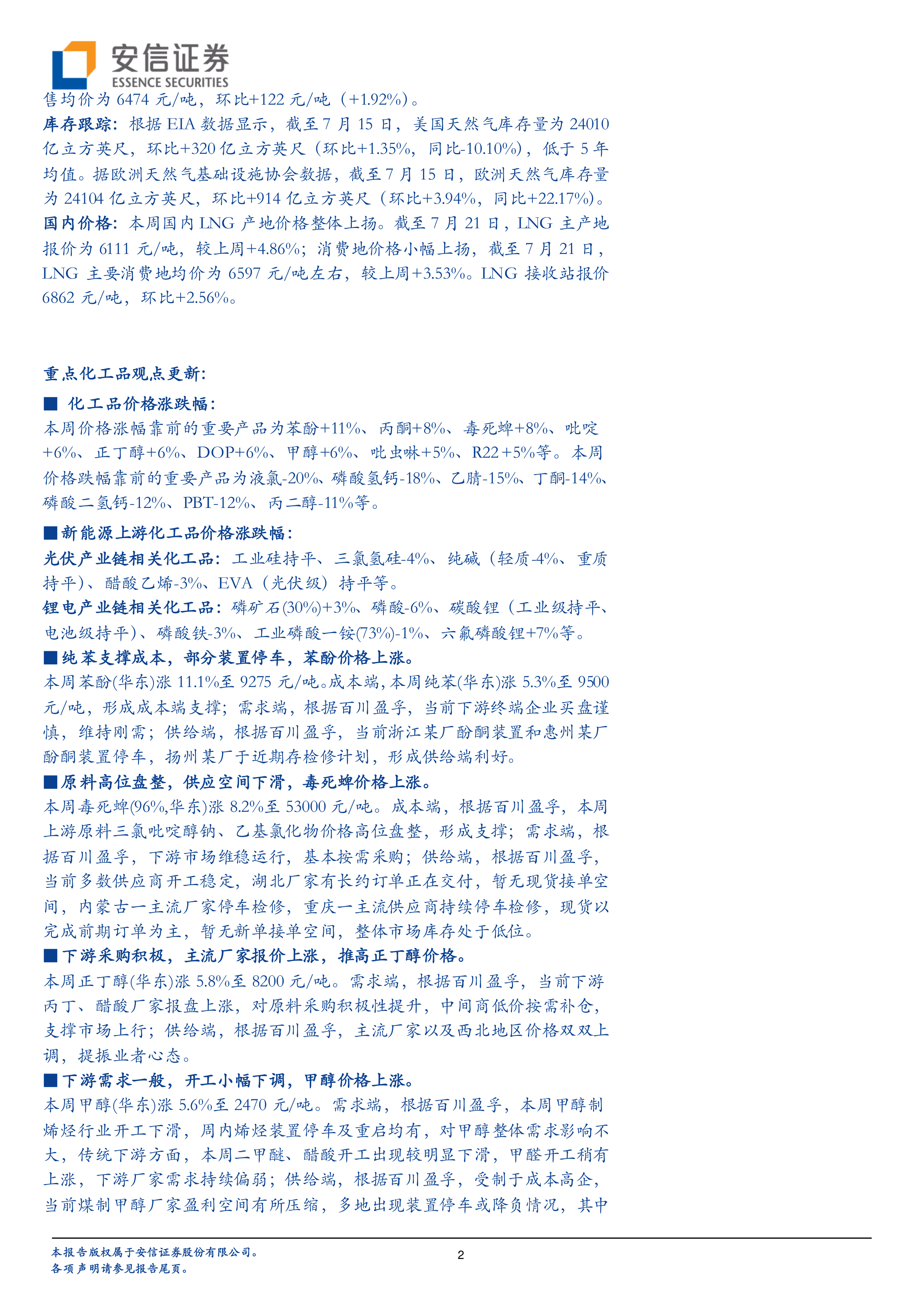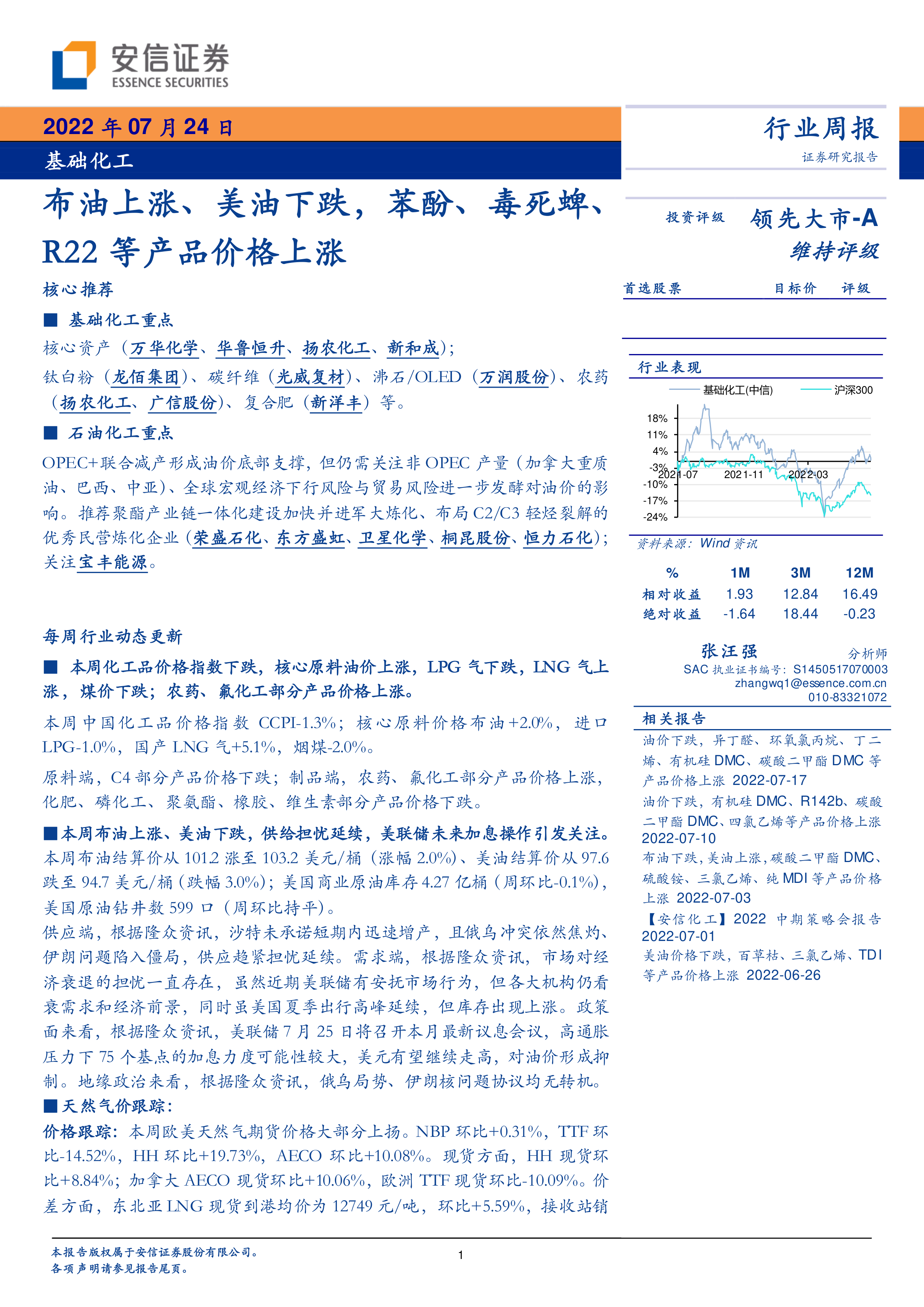 本报告的核心观点是:基础化工行业本周表现分化,部分产品价格上涨,部分产品价格下跌。油价波动是影响本周化工品价格的重要因素,布油上涨,美油下跌,导致部分依赖石油化工原料的产品价格上涨。同时,宏观经济下行风险、地缘政治局势以及美联储加息预期等因素也对化工品价格走势产生影响。报告重点关注了苯酚、毒死蜱、正丁醇、R22等价格上涨的产品,并分析了其涨价原因,同时指出液氯、磷酸氢钙、乙腈等价格下跌的产品。