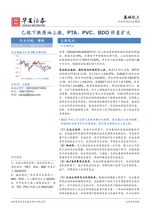本报告以2023年1月9日至13日为时间范围,对化工行业进行了周度回顾和分析,主要内容包括: