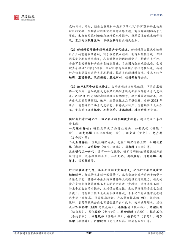 报告指出,2023年化工行业将呈现分化趋势,并推荐关注以下三个投资方向: