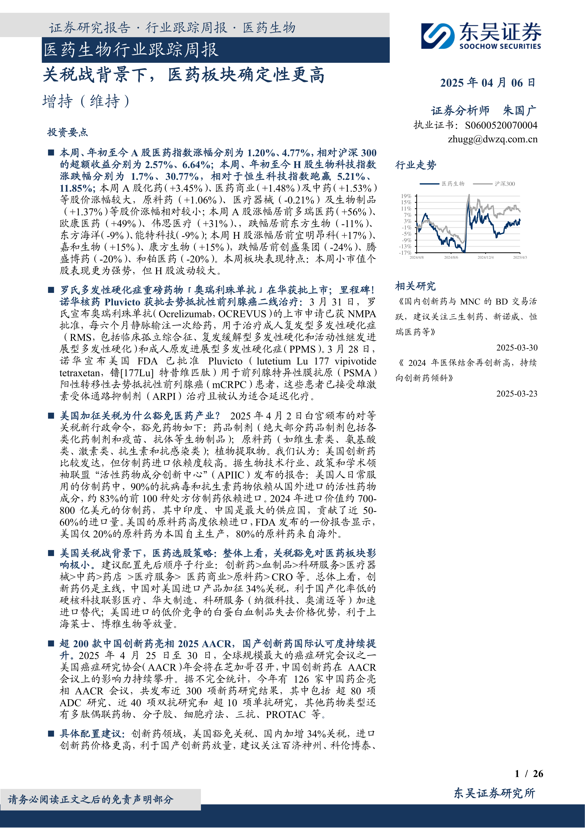 本报告详细分析了医药生物行业近期市场表现,并结合关税战背景下医药板块的投资机会,提供了具体的投资建议。