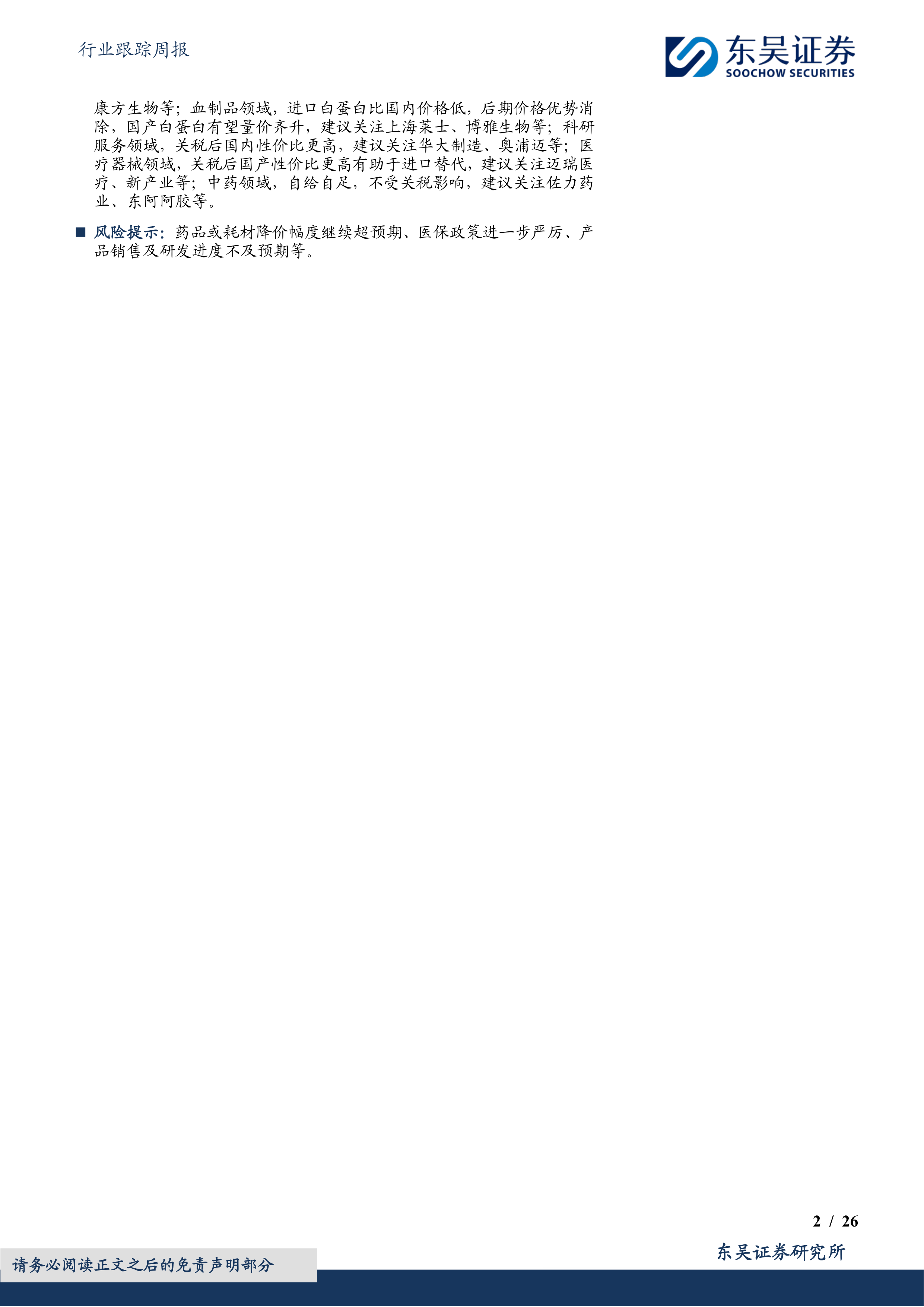 本报告基于市场数据和行业分析,认为关税战对医药板块的影响有限,创新药和国产替代将是未来医药行业的主要投资方向。报告建议投资者优先配置创新药、血制品、科研服务等子行业,并提供了具体的投资标的建议。 然而,投资者仍需关注药品降价、医保政策以及研发进度等风险因素。 报告中提供的投资建议仅供参考,投资者应根据自身情况进行独立判断。