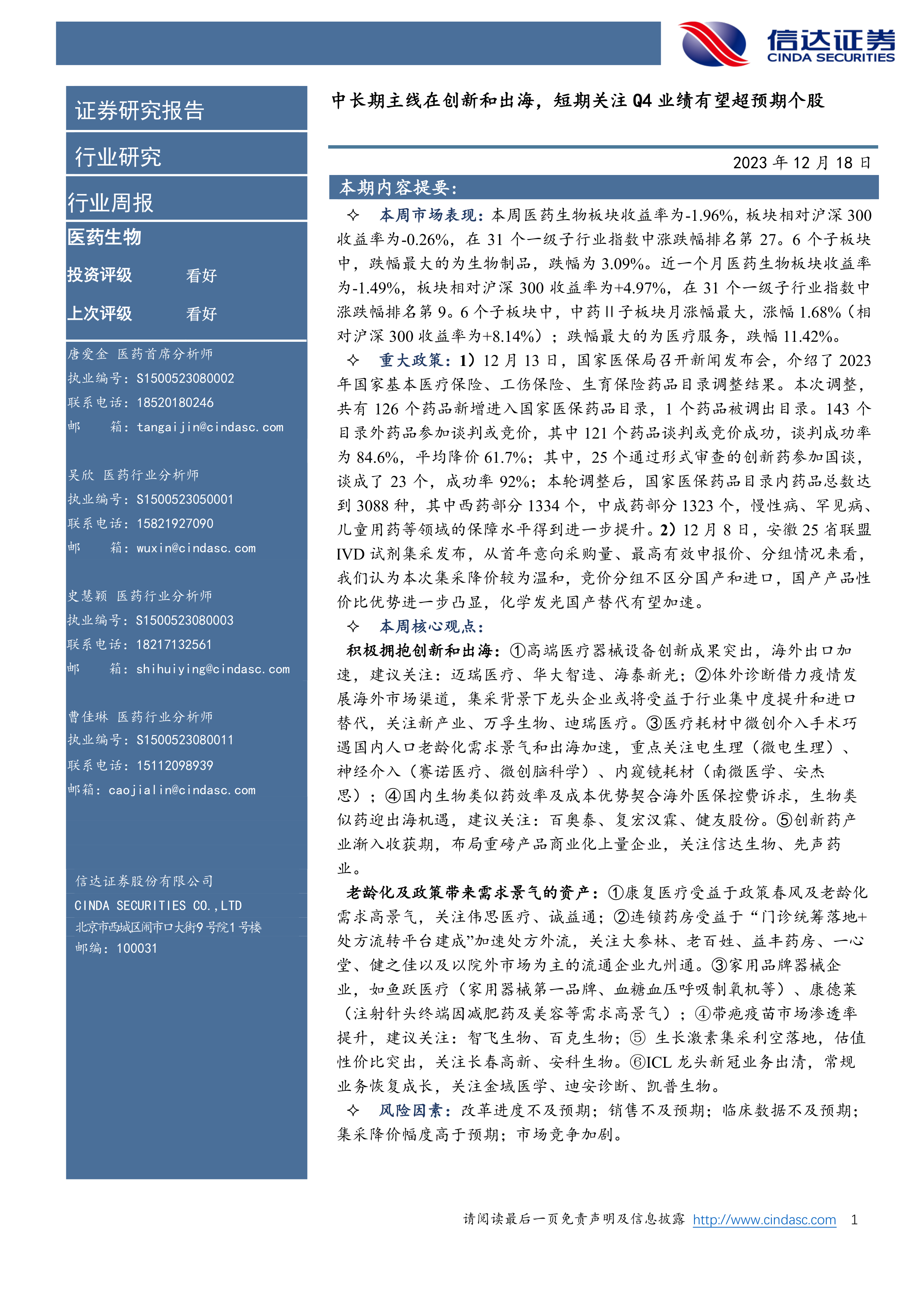 本报告对医药生物行业近期市场表现、重大政策以及细分行业发展趋势进行了全面分析,并在此基础上提出了相应的投资策略。信达证券建议投资者中长期关注创新和出海的优质标的,短期关注2023年第四季度业绩有望超预期的个股。 报告中提供的市场数据、政策解读以及个股分析,为投资者提供了较为全面的参考信息,但投资者仍需根据自身情况进行独立判断,并承担相应的投资风险。 需要注意的是,报告中提到的个股仅供参考,并非投资建议。