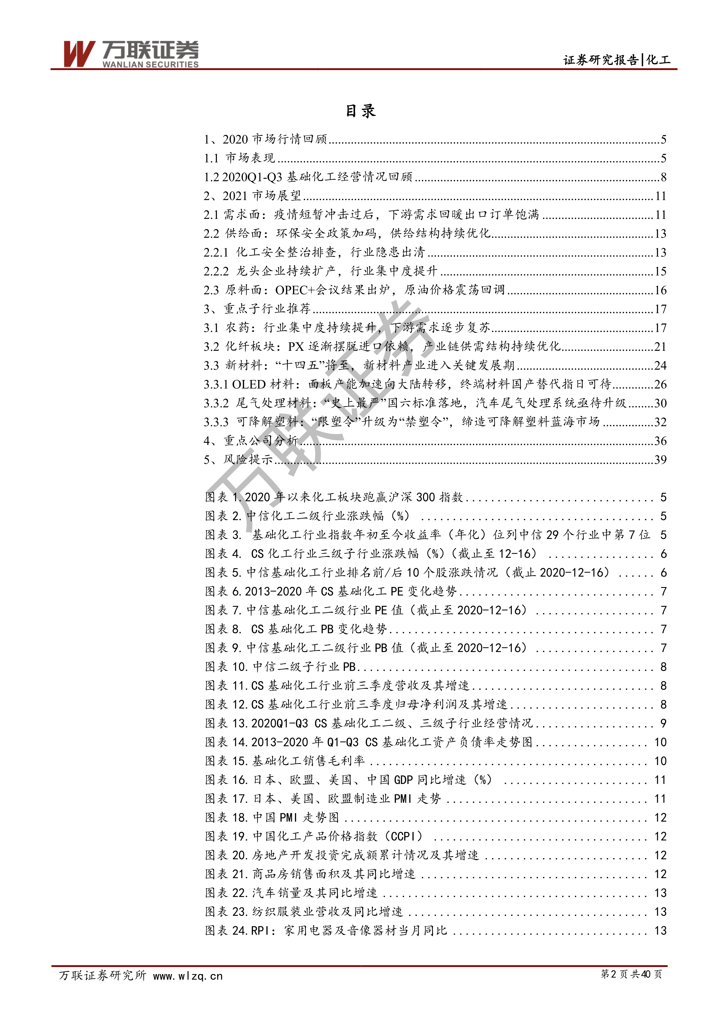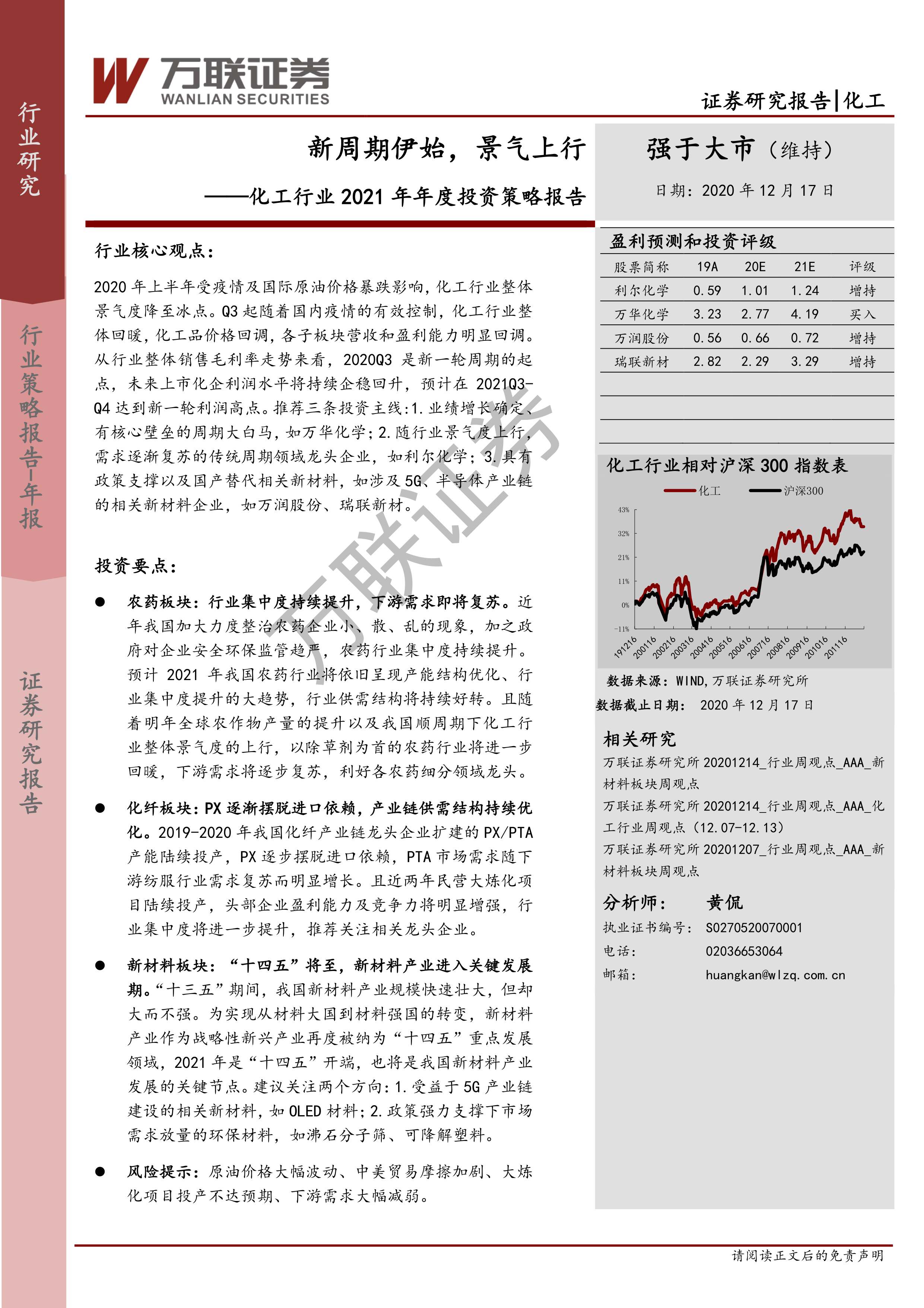 本报告对2020年化工行业市场行情进行了回顾,并对2021年市场进行了展望,重点分析了农药、化纤和新材料三个子行业,并对利尔化学、万华化学、万润股份和瑞联新材四家公司进行了深入研究。报告认为,2021年化工行业景气度将持续上行,利润水平将企稳回升,并推荐了三条投资主线。 需要注意的是,报告中提到的风险提示,例如原油价格波动、疫情反复等,需要投资者密切关注。