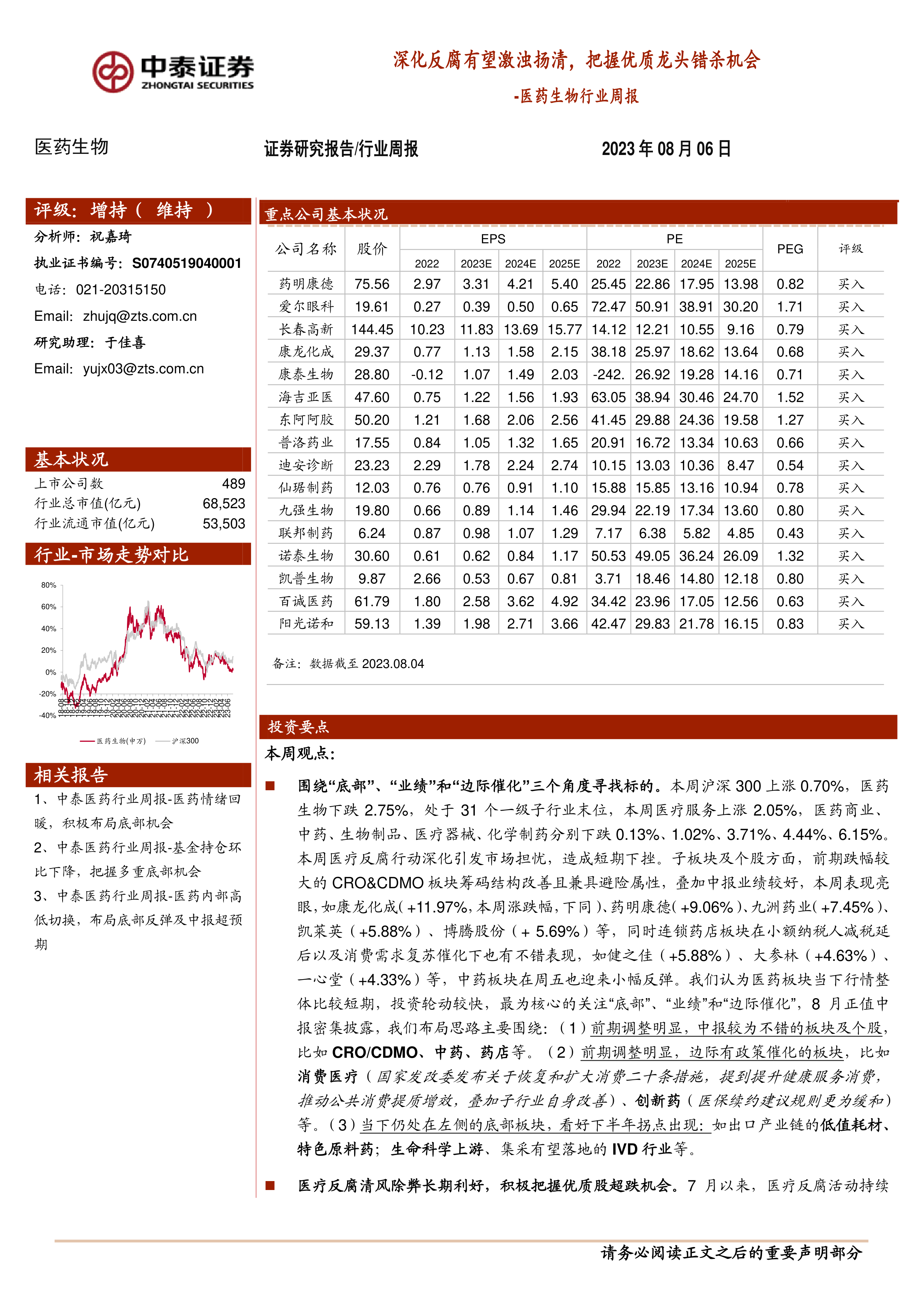 本报告的核心观点是:医疗反腐的深化虽然造成医药板块短期下挫,但长期来看利好行业发展,将促进行业规范化和集中度提升。投资者应关注“底部”、“业绩”和“边际催化”三个角度,积极把握优质龙头股的超跌机会。