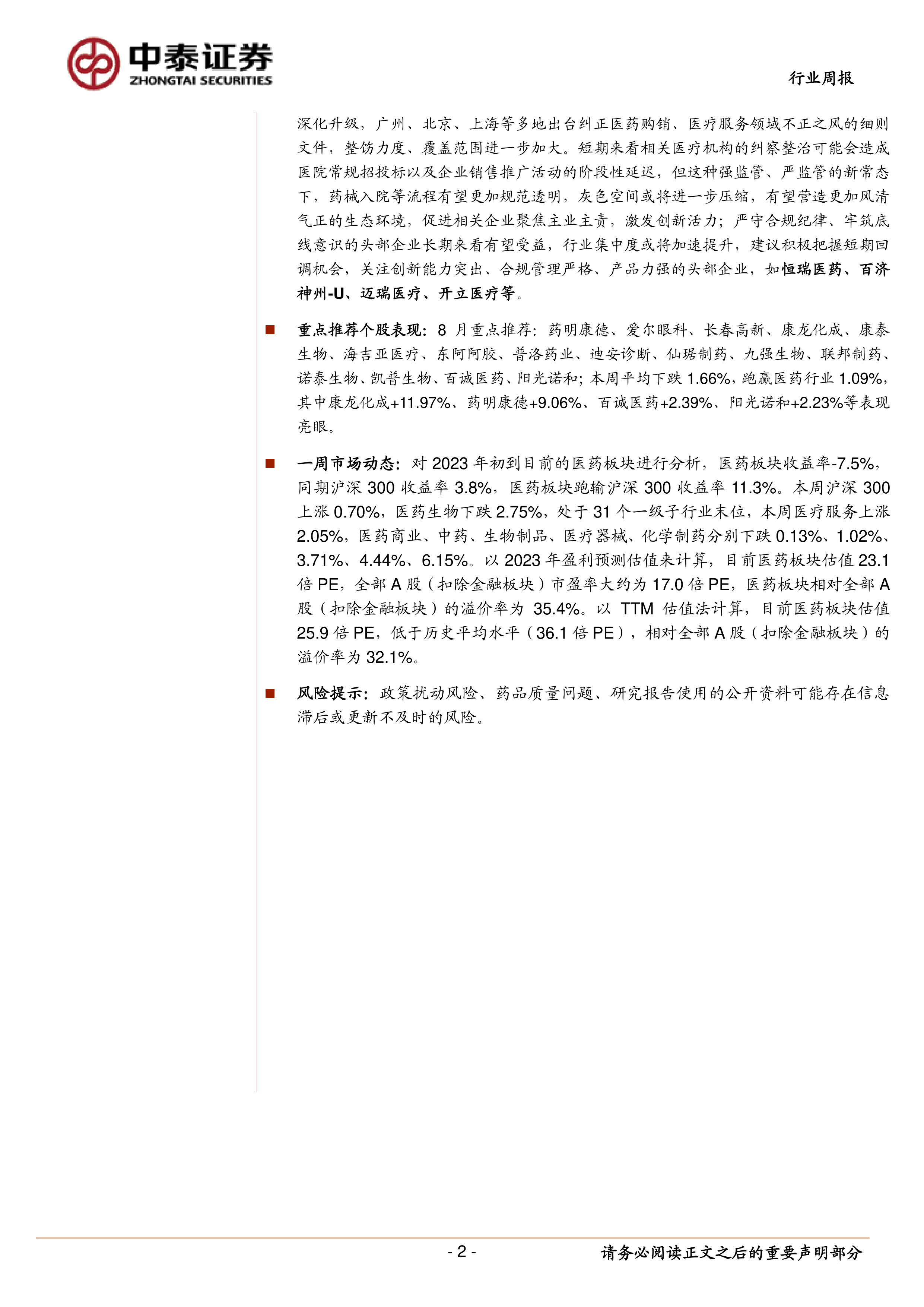 一周市场动态:对 2023 年初到目前的医药板块进行分析,医药板块收益率-7.5%,同期沪深 300 收益率 3.8%,医药板块跑输沪深 300 收益率 11.3%。本周沪深 300上涨 0.70%,医药生物下跌 2.75%,处于 31 个一级子行业末位,本周医疗服务上涨2.05%,医药商业、中药、生物制品、医疗器械、化学制药分别下跌 0.13%、1.02%、3.71%、4.44%、6.15%。以 2023 年盈利预测估值来计算,目前医药板块估值 23.1倍 PE,全部 A 股(扣除金融板块)市盈率大约为 17.0 倍 PE,医药板块相对全部 A股(扣除金融板块)的溢价率为 35.4%。以 TTM 估值法计算,目前医药板块估值25.9 倍 PE,低于历史平均水平(36.1 倍 PE),相对全部 A 股(扣除金融板块)的溢价率为 32.1%。