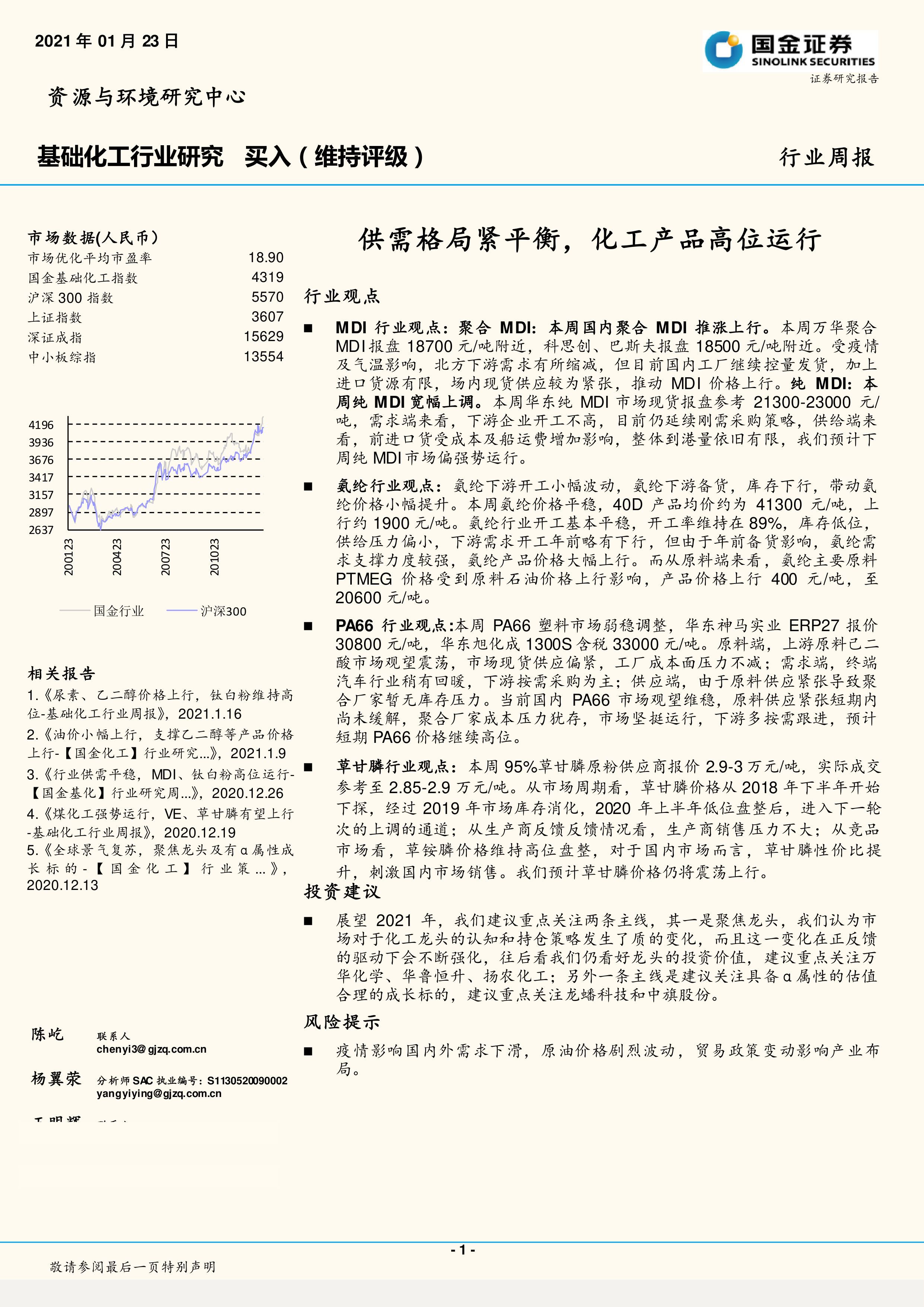 本报告的核心观点是:2021年1月,基础化工行业供需格局紧平衡,多数化工产品价格高位运行。MDI、氨纶、PA66、草甘膦等产品价格上涨,主要受供给侧收缩、下游备货以及原料价格上涨等因素驱动。 报告建议重点关注万华化学、华鲁恒升、扬农化工等龙头企业,以及龙蟠科技和中旗股份等具备α属性的成长标的。 但报告也提示了疫情影响、原油价格波动以及贸易政策变动等风险因素。