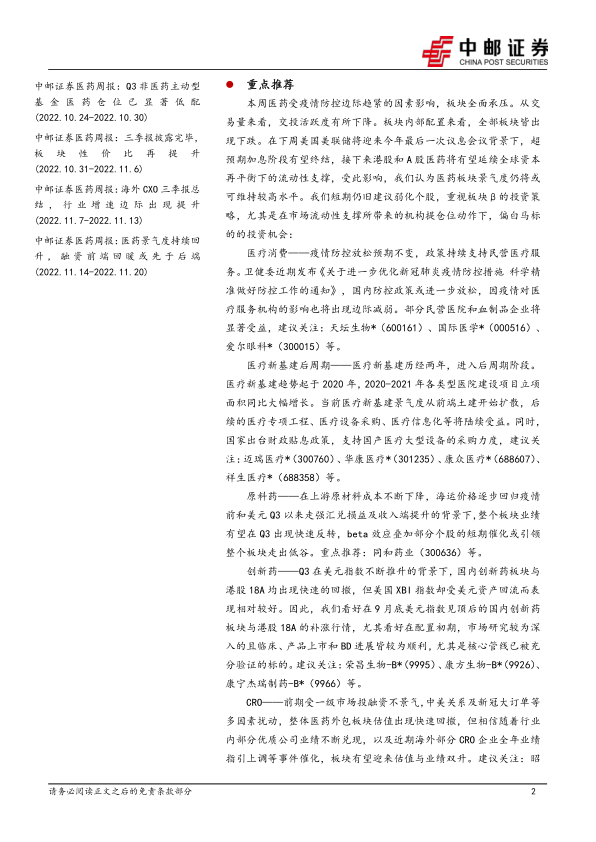 本周医药板块受疫情防控边际趋紧影响承压,交易量下降。但报告认为,随着美联储加息预期结束,港股和A股医药板块有望获得流动性支撑,维持较高景气度。报告建议短期弱化个股,重视板块β,关注白马股投资机会,并重点推荐了医疗消费、医疗新基建后周期、原料药、创新药和CRO等领域的个股。