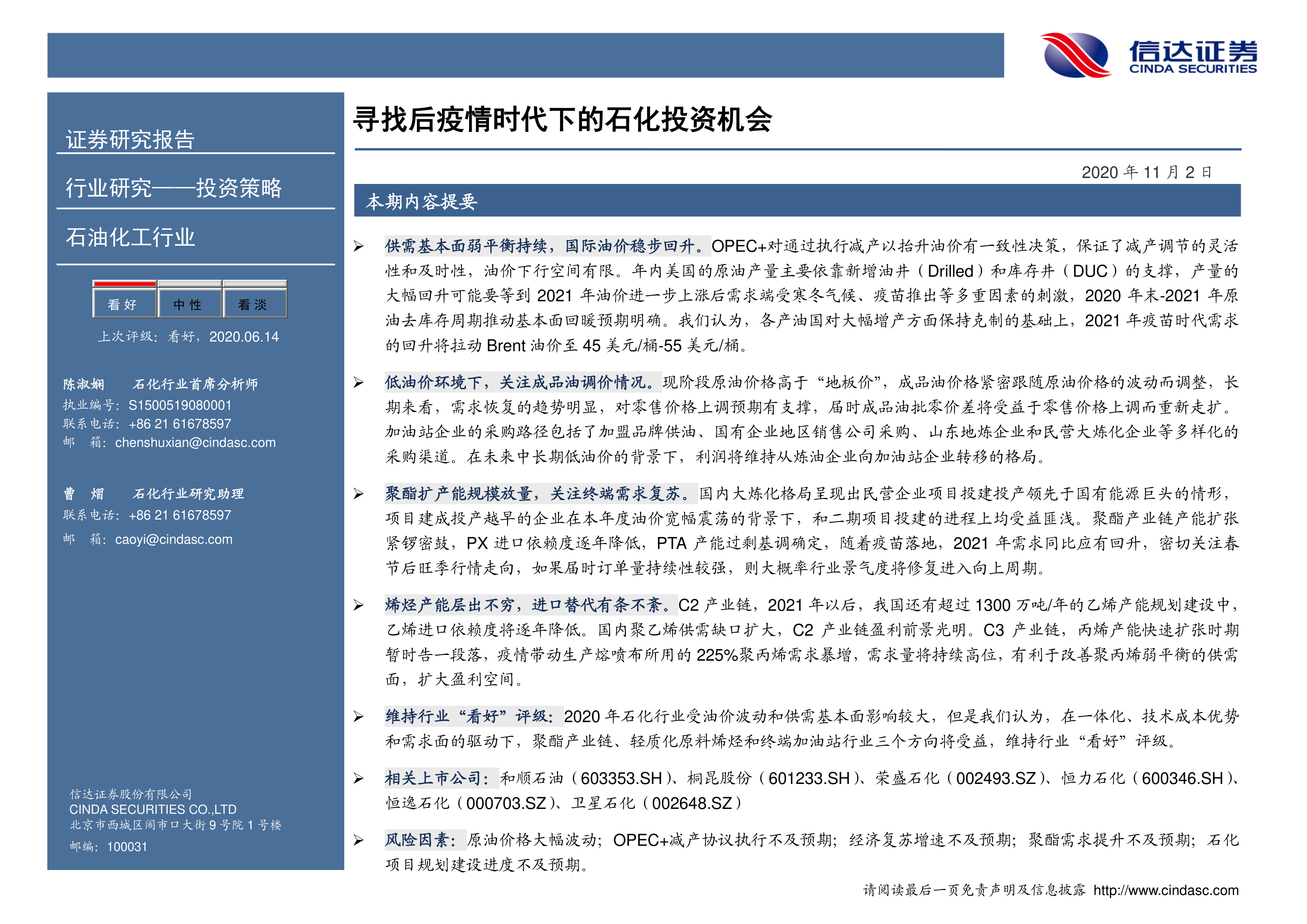风险因素:原油价格大幅波动;OPEC+减产协议执行不及预期;经济复苏增速不及预期;聚酯需求提升不及预期;石化项目规划建设进度不及预期。