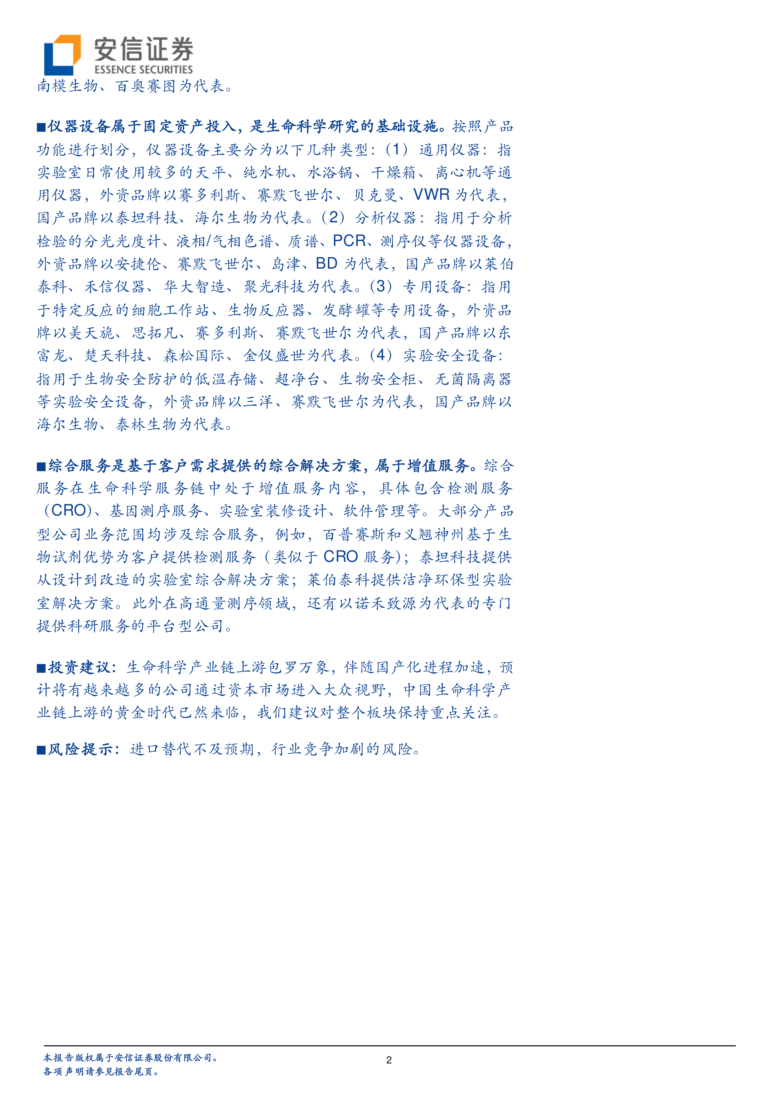 投资建议:生命科学产业链上游包罗万象,伴随国产化进程加速,预计将有越来越多的公司通过资本市场进入大众视野,中国生命科学产业链上游的黄金时代已然来临,我们建议对整个板块保持重点关注。