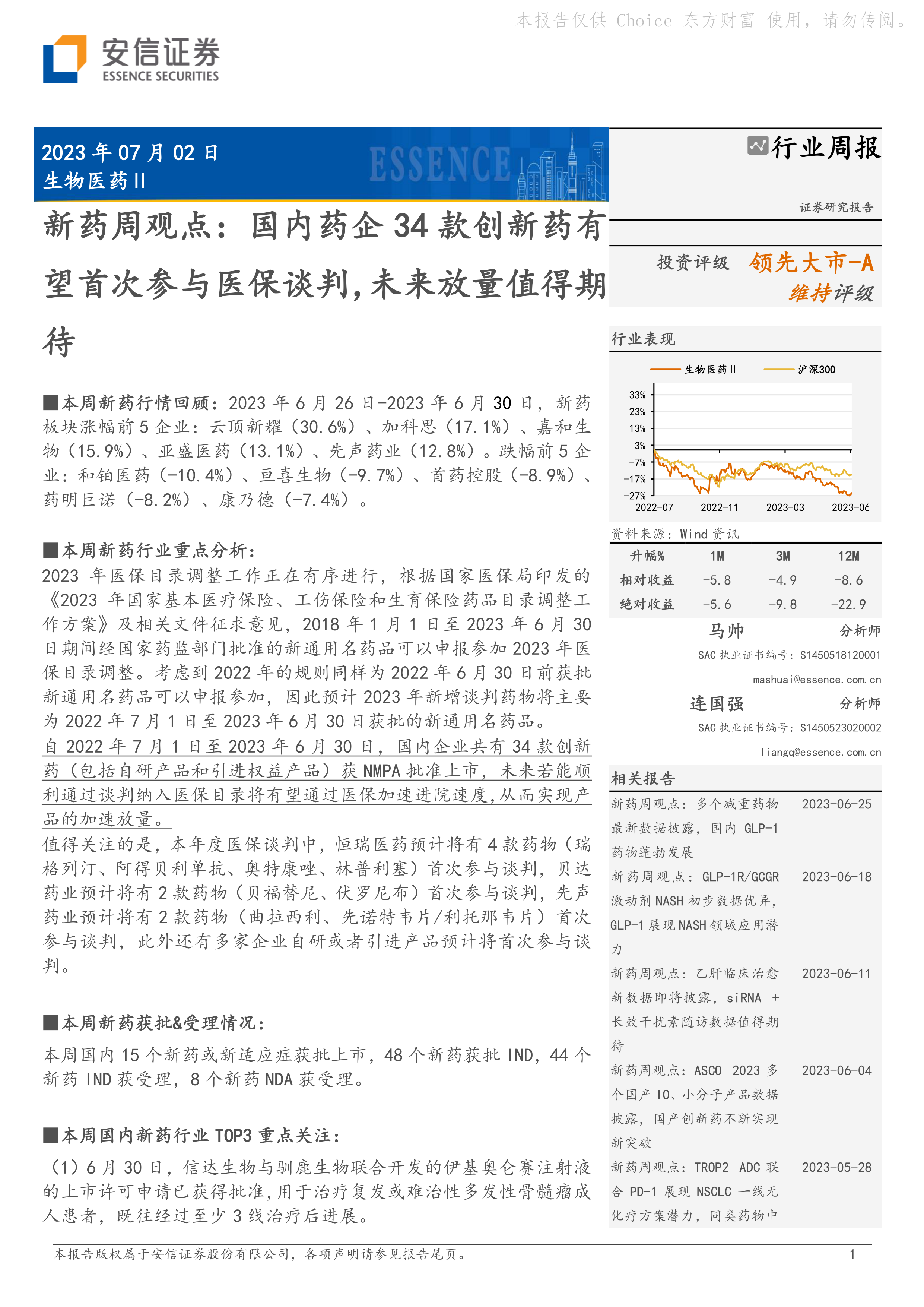 本报告的核心观点是:2023年上半年中国创新药市场发展迅速,共有34款创新药获批上市,其中多款药物有望参与医保谈判,这将显著加速其市场放量。报告同时分析了本周新药市场行情、重点获批及受理的新药情况,并对国内外新药行业重点关注事件进行了总结。