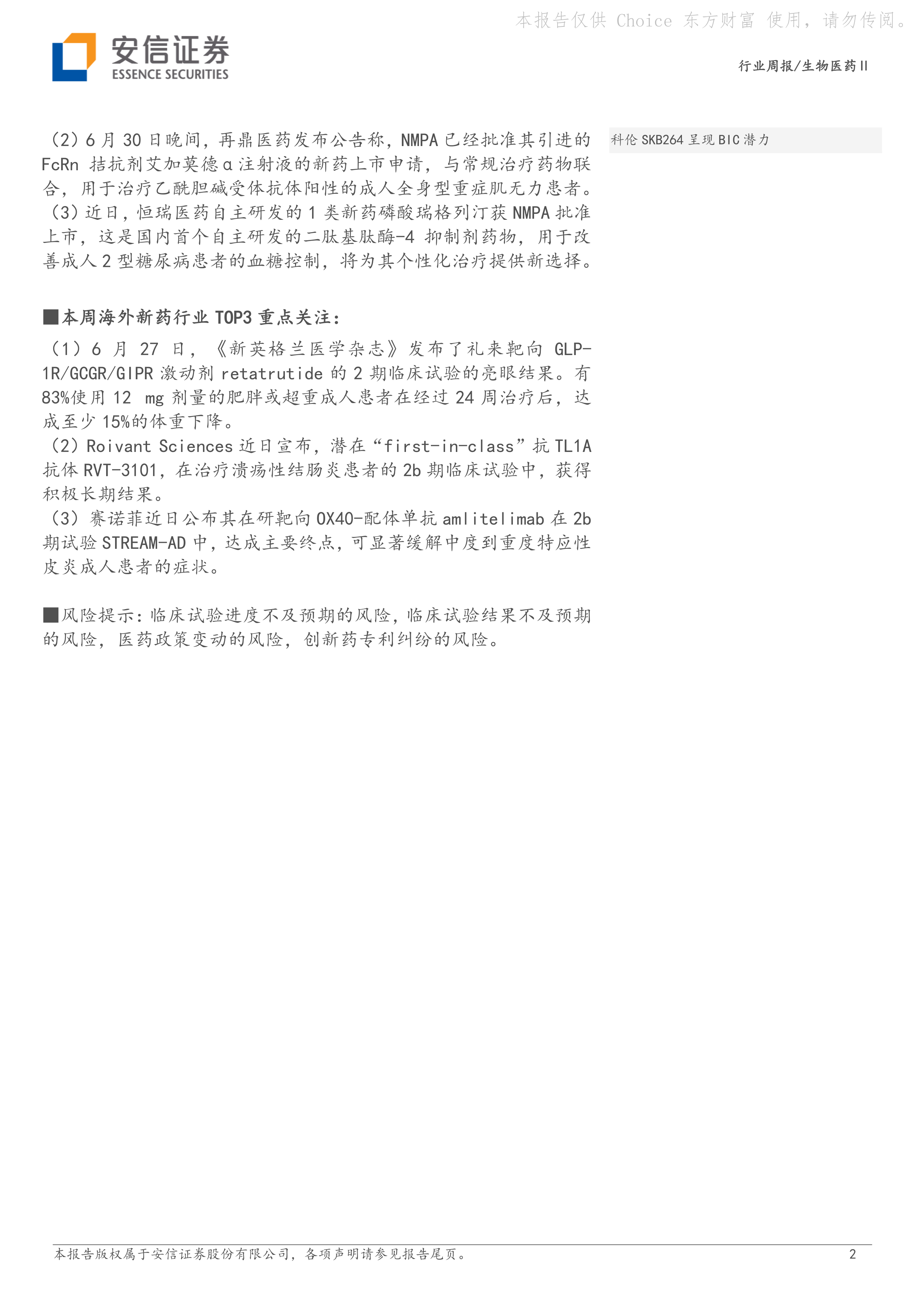 本报告通过对本周新药市场行情、重点获批及受理的新药情况以及国内外新药行业重点关注事件的分析,总结了2023年上半年中国创新药市场发展迅速的现状。 34款创新药的获批上市以及多款药物有望参与医保谈判,将显著推动国内创新药市场加速放量。 报告也指出了临床试验进度不及预期、临床试验结果不及预期、医药政策变动以及创新药专利纠纷等潜在风险。 未来,医保政策的走向以及临床试验结果将继续对创新药市场发展产生重大影响。 投资者需密切关注相关动态,谨慎决策。