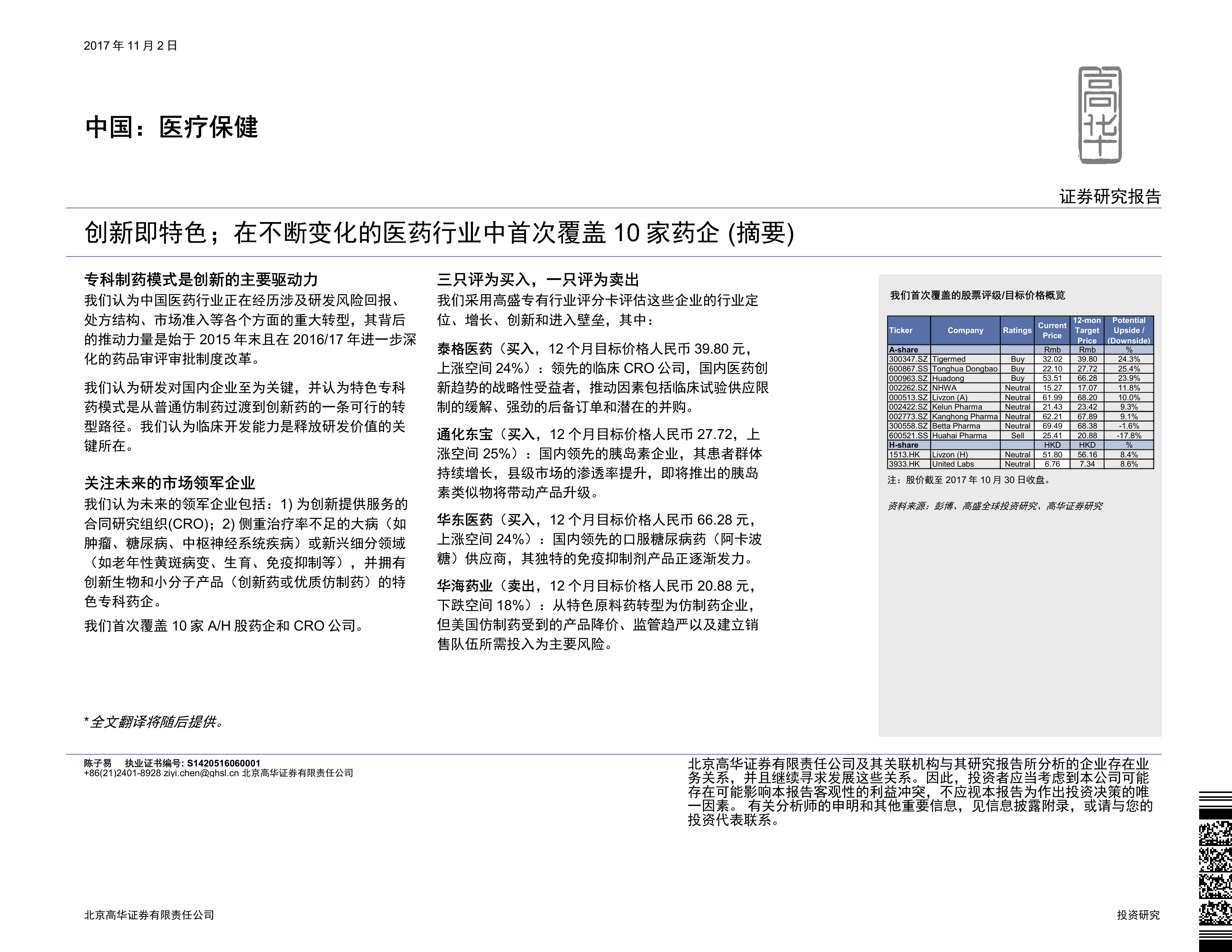 最终,报告给出投资建议:泰格医药(买入,12个月目标价人民币39.80元,上涨空间24%),通化东宝(买入,12个月目标价人民币27.72元,上涨空间25%),华东医药(买入,12个月目标价人民币66.28元,上涨空间24%),华海药业(卖出,12个月目标价人民币20.88元,下跌空间18%),其余公司(丽珠集团、贝达药业、康弘药业、联合制药、恩华药业、科伦药业)评级为中性。