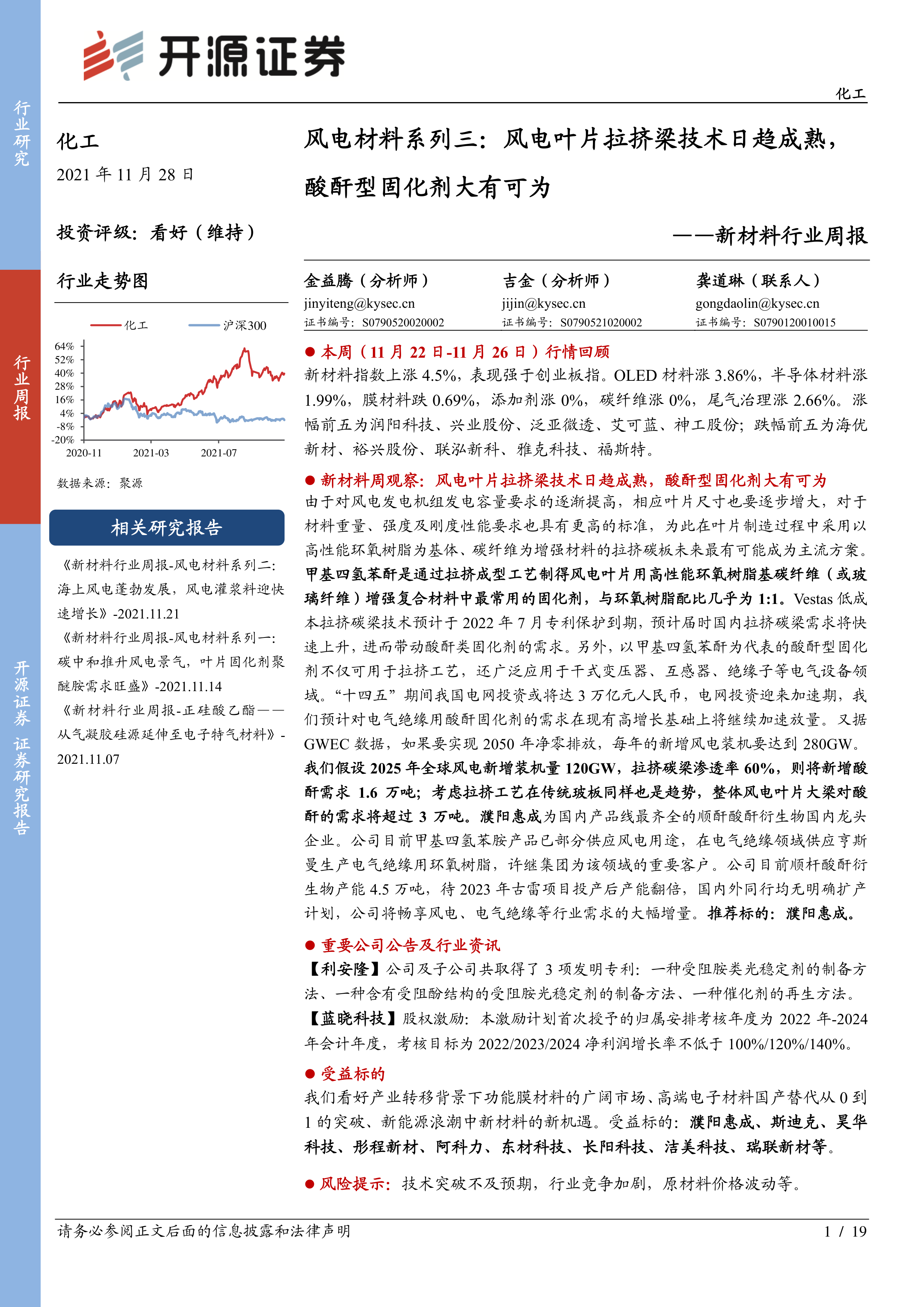 新材料行业周报:风电材料系列三:风电叶片拉挤梁技术日趋成熟,酸酐型固化剂大有可为