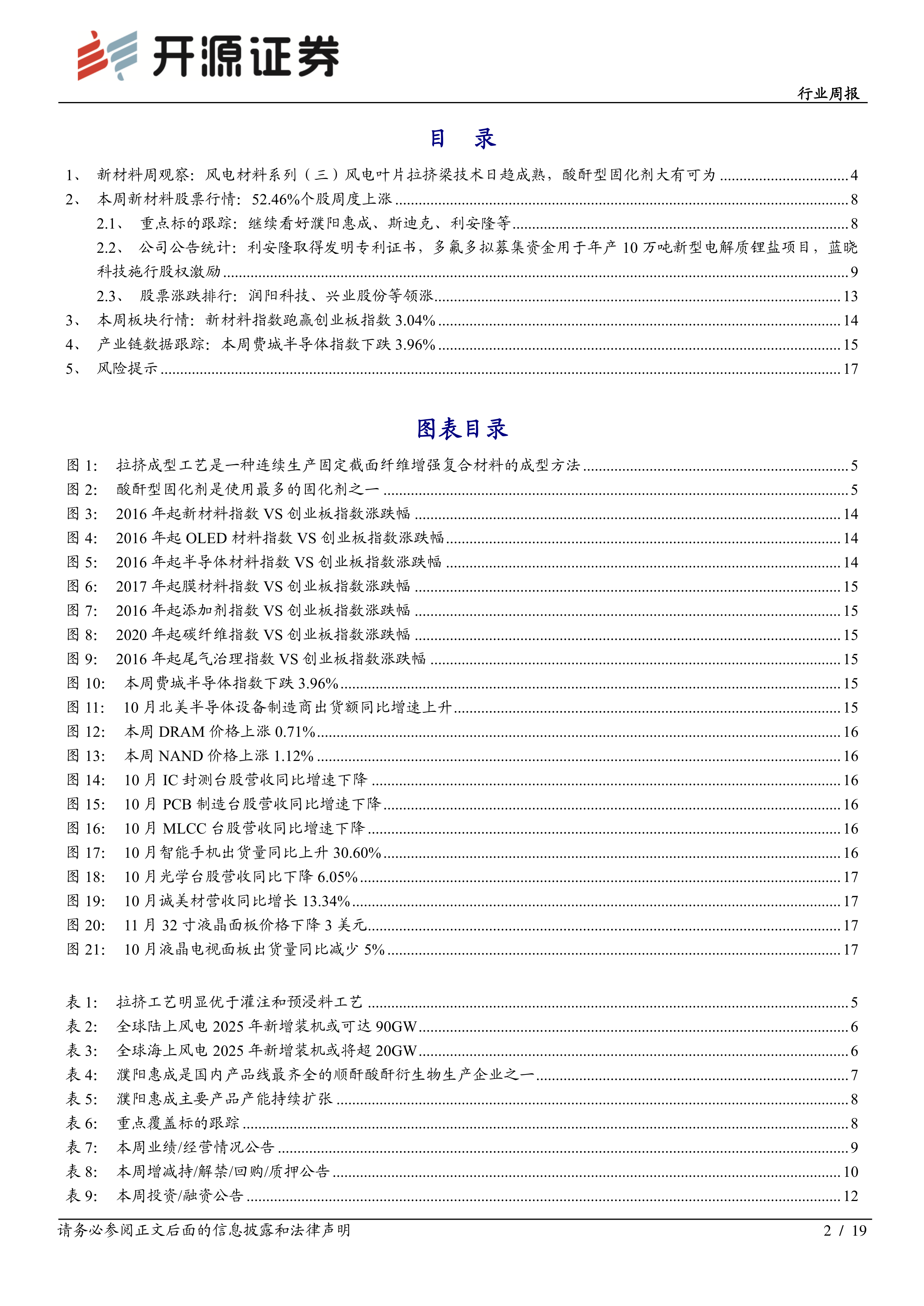 本报告基于对风电行业发展趋势和新材料市场动态的分析,重点关注了风电叶片拉挤梁技术对酸酐型固化剂需求的影响。报告预测,随着风电装机容量的持续增长和拉挤技术的普及,酸酐型固化剂,特别是甲基四氢苯酐,将迎来快速发展期。国内龙头企业濮阳惠成凭借其全面的产品线和产能扩张计划,有望在这一市场中获得显著收益。 然而,技术突破不及预期、行业竞争加剧以及原材料价格波动等风险也需要关注。 报告还提供了本周新材料板块的股票行情、公司公告以及产业链数据跟踪,为投资者提供参考信息。