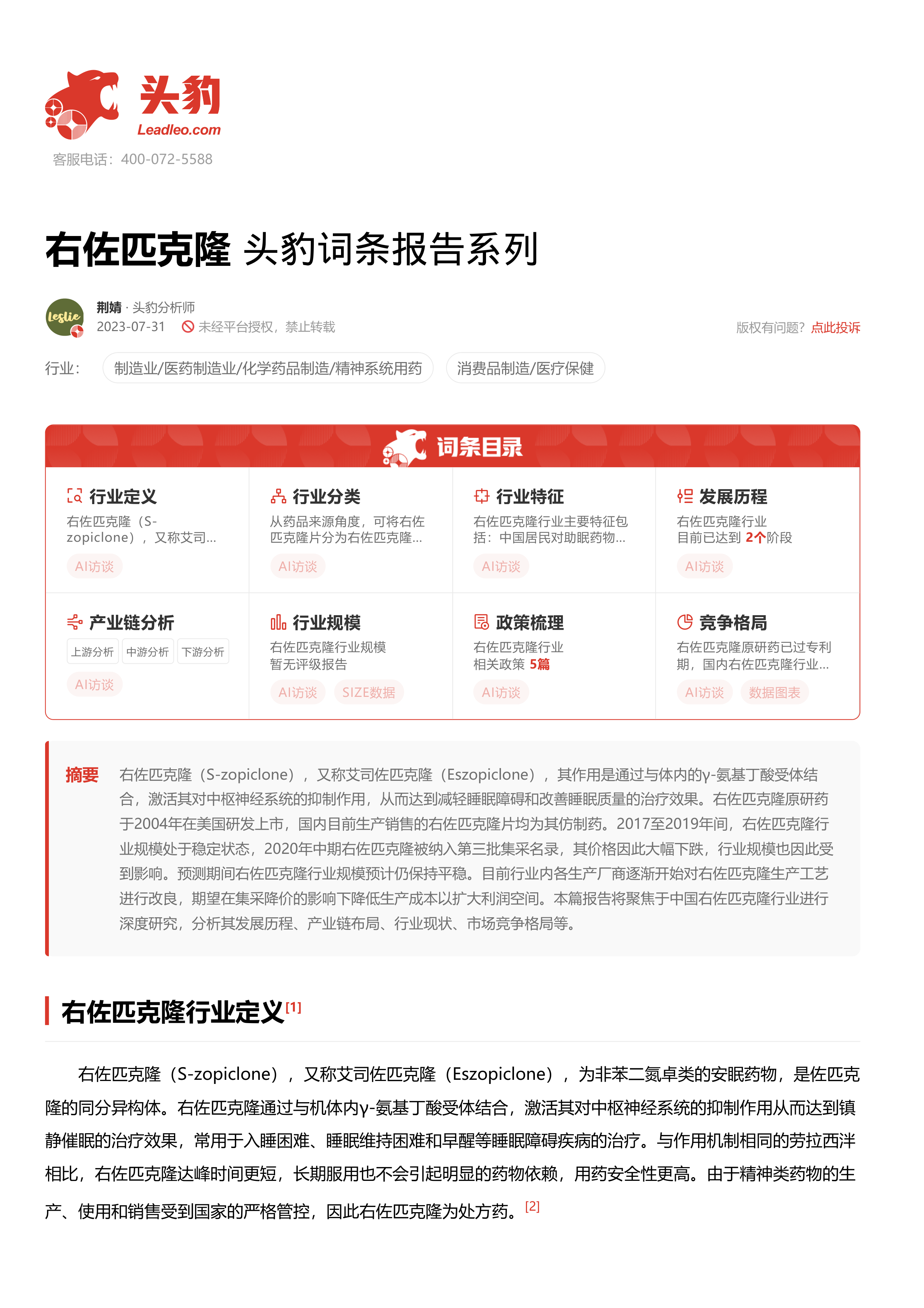 右佐匹克隆(S-zopiclone),又称艾司佐匹克隆(Eszopiclone),其作用是通过与体内的γ-氨基丁酸受体结合,激活其对中枢神经系统的抑制作用,从而达到减轻睡眠障碍和改善睡眠质量的治疗效果。右佐匹克隆原研药于2004年在美国研发上市,国内目前生产销售的右佐匹克隆片均为其仿制药。2017至2019年间,右佐匹克隆行业规模处于稳定状态,2020年中期右佐匹克隆被纳入第三批集采名录,其价格因此大幅下跌,行业规模也因此受到影响。预测期间右佐匹克隆行业规模预计仍保持平稳。目前行业内各生产厂商逐渐开始对右佐匹克隆生产工艺进行改良,期望在集采降价的影响下降低生产成本以扩大利润空间。本篇报告将聚焦于中国右佐匹克隆行业进行深度研究,分析其发展历程、产业链布局、行业现状、市场竞争格局等。