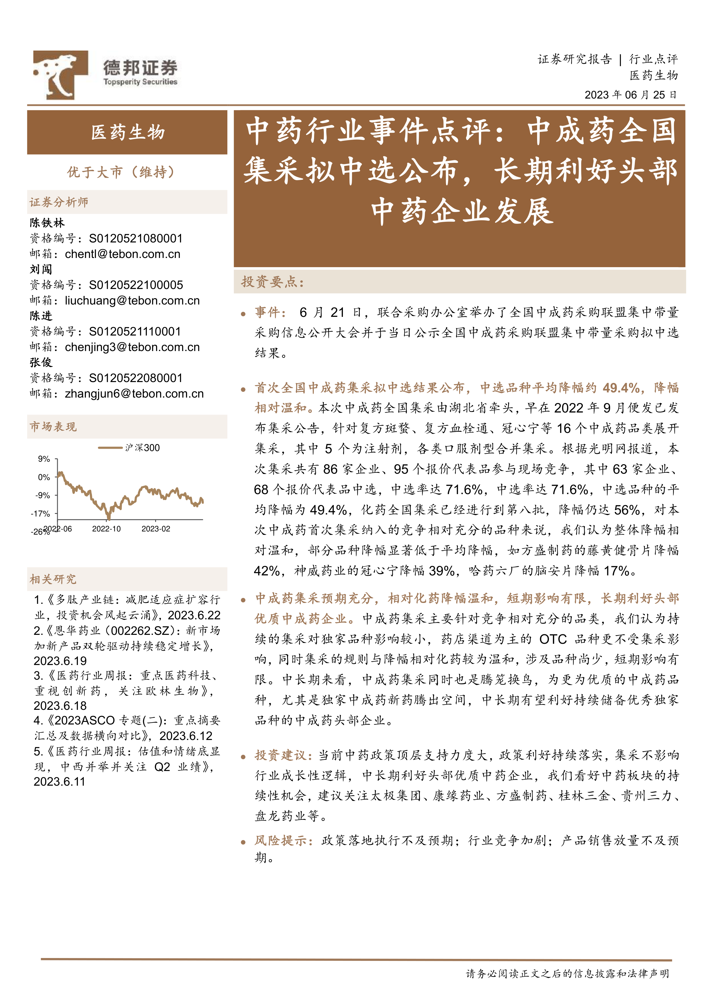 中成药集采预期充分,相对化药降幅温和,短期影响有限,长期利好头部优质中成药企业。中成药集采主要针对竞争相对充分的品类,我们认为持续的集采对独家品种影响较小,药店渠道为主的OTC品种更不受集采影响,同时集采的规则与降幅相对化药较为温和,涉及品种尚少,短期影响有限。中长期来看,中成药集采同时也是腾笼换鸟,为更为优质的中成药品种,尤其是独家中成药新药腾出空间,中长期有望利好持续储备优秀独家品种的中成药头部企业。