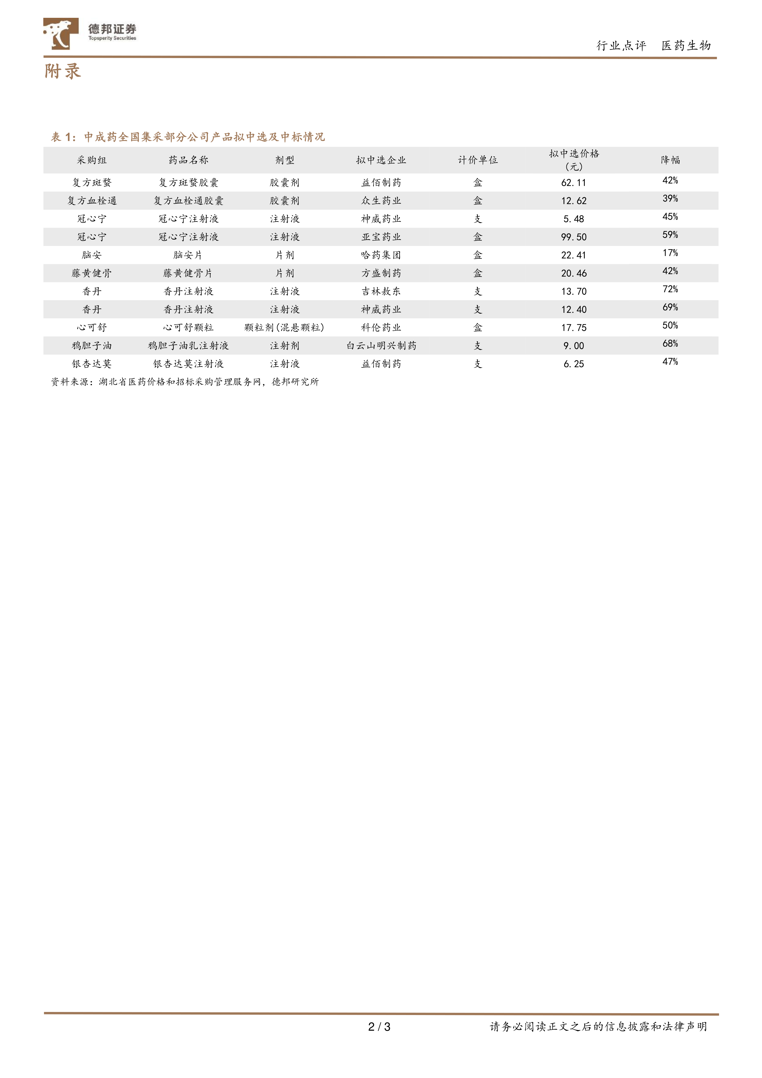 本次报告的核心观点是:全国中成药集采拟中选结果公布,平均降幅49.4%,相对温和,短期影响有限,长期利好头部优质中药企业。