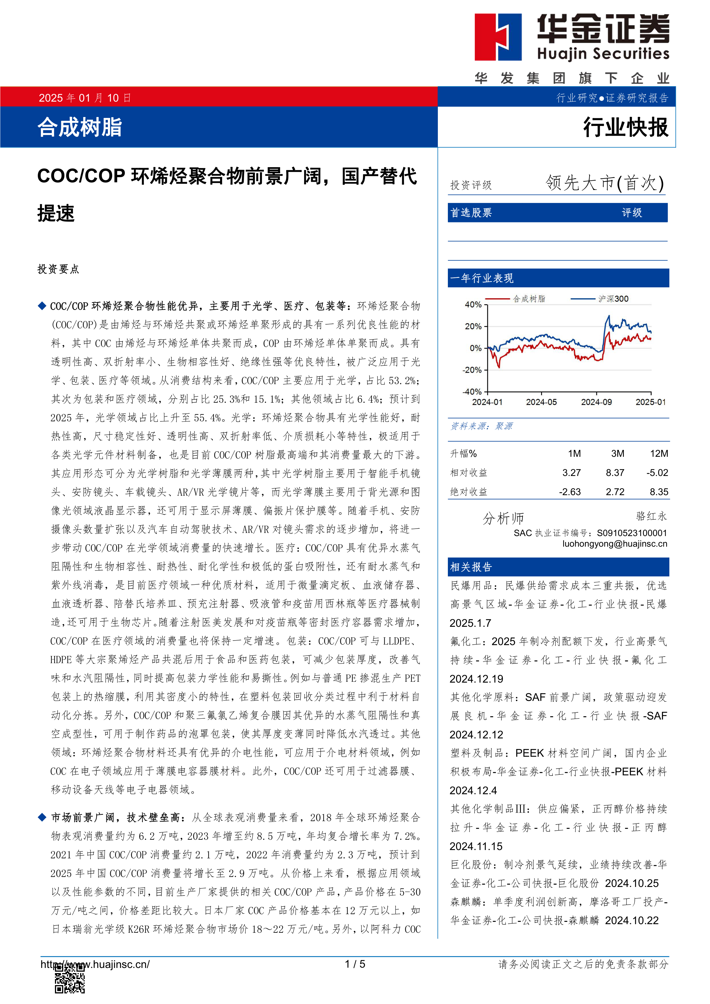 本报告的核心观点是:环烯烃聚合物(COC/COP)市场前景广阔,国产替代加速,投资机会显著。